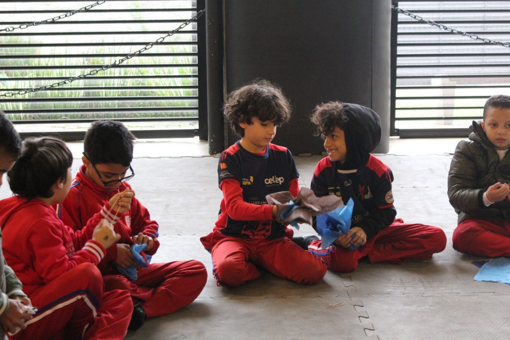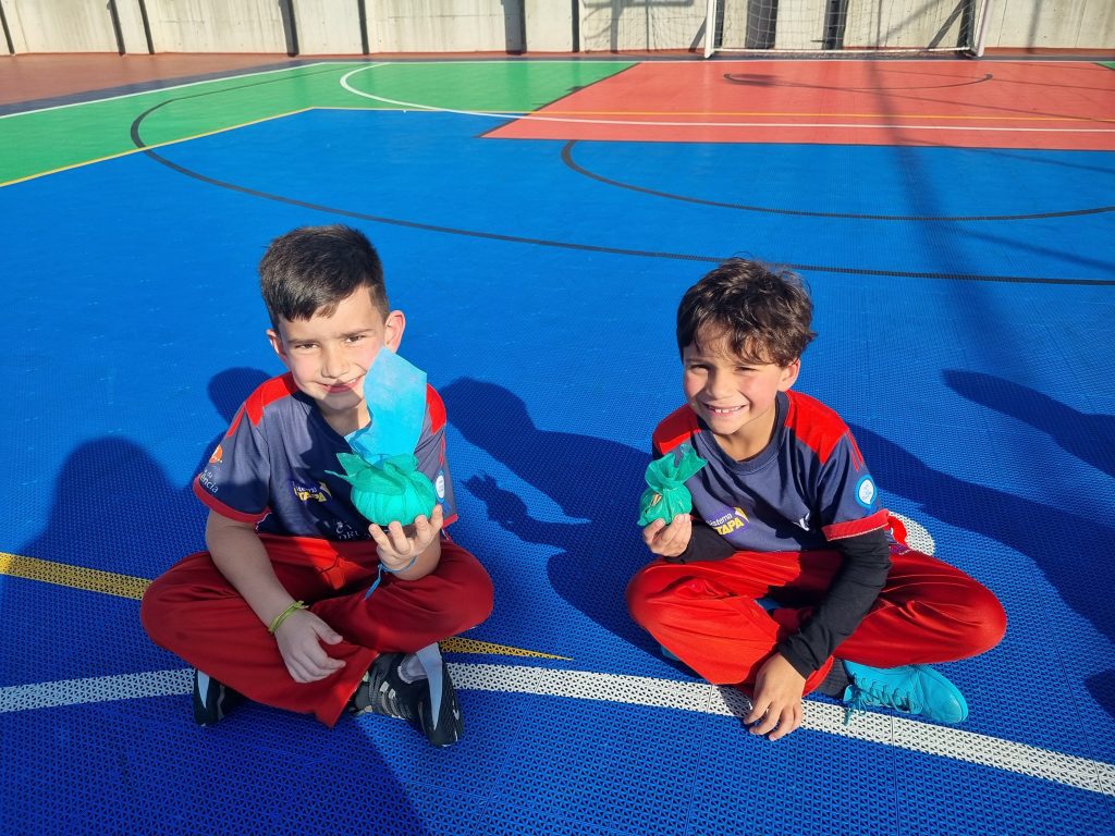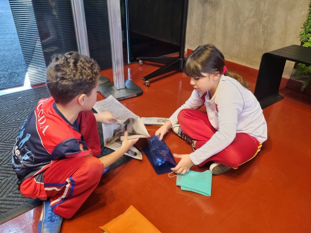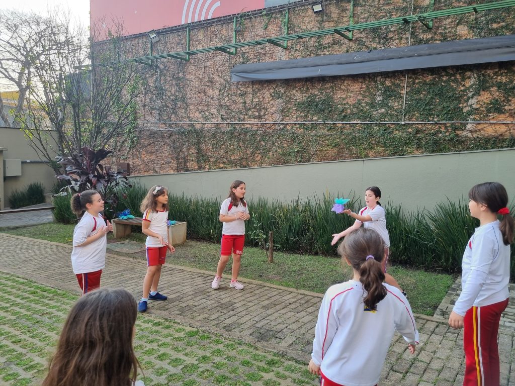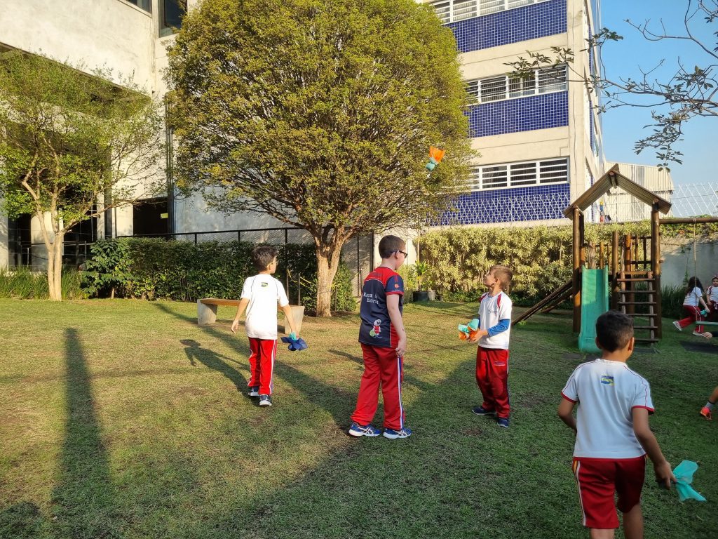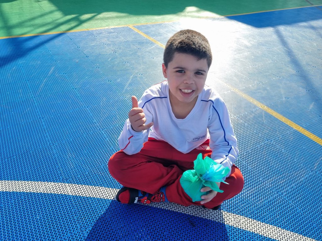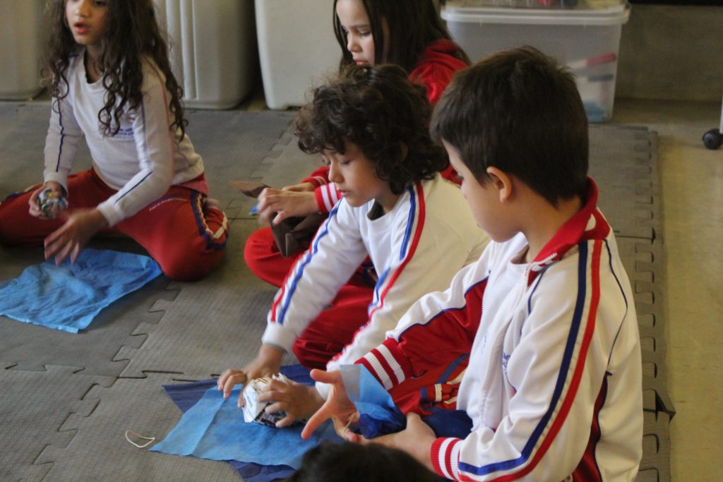 Os alunos conheceram a Peteca, um objeto/brinquedo que possui origem indígena. Na escola, os alunos puderam criar suas próprias Petecas utilizando papel, tecido e elástico, mas compreenderam que em sua origem, o brinquedo é confeccionado com elementos da natureza, como penas e palha seca.