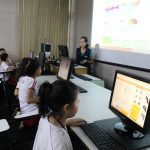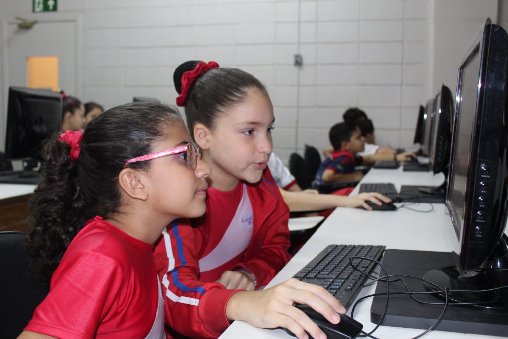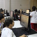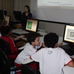 Na aula de informática os alunos do 4º ano entraram no jogo educativo Racha Cuca, que são jogos de raciocínio.