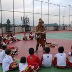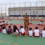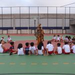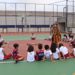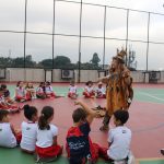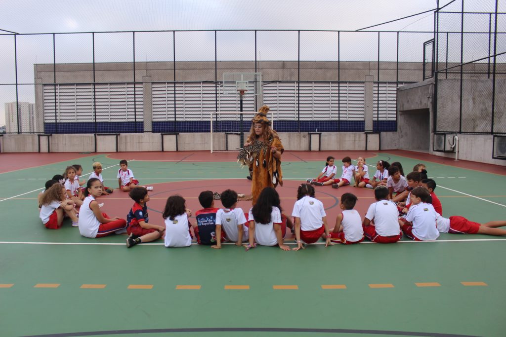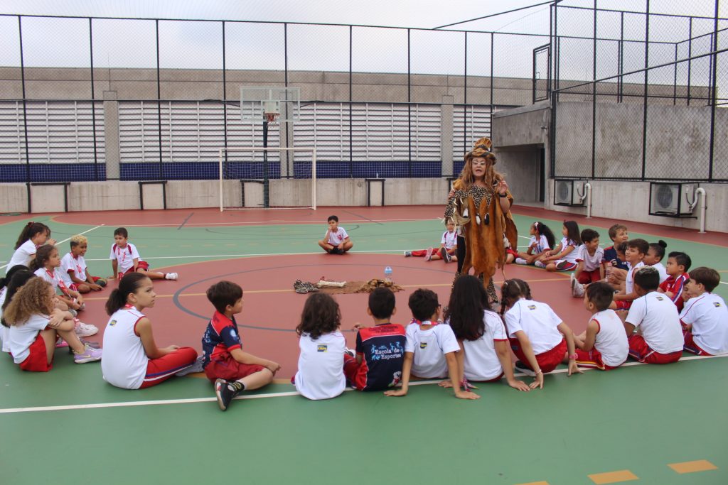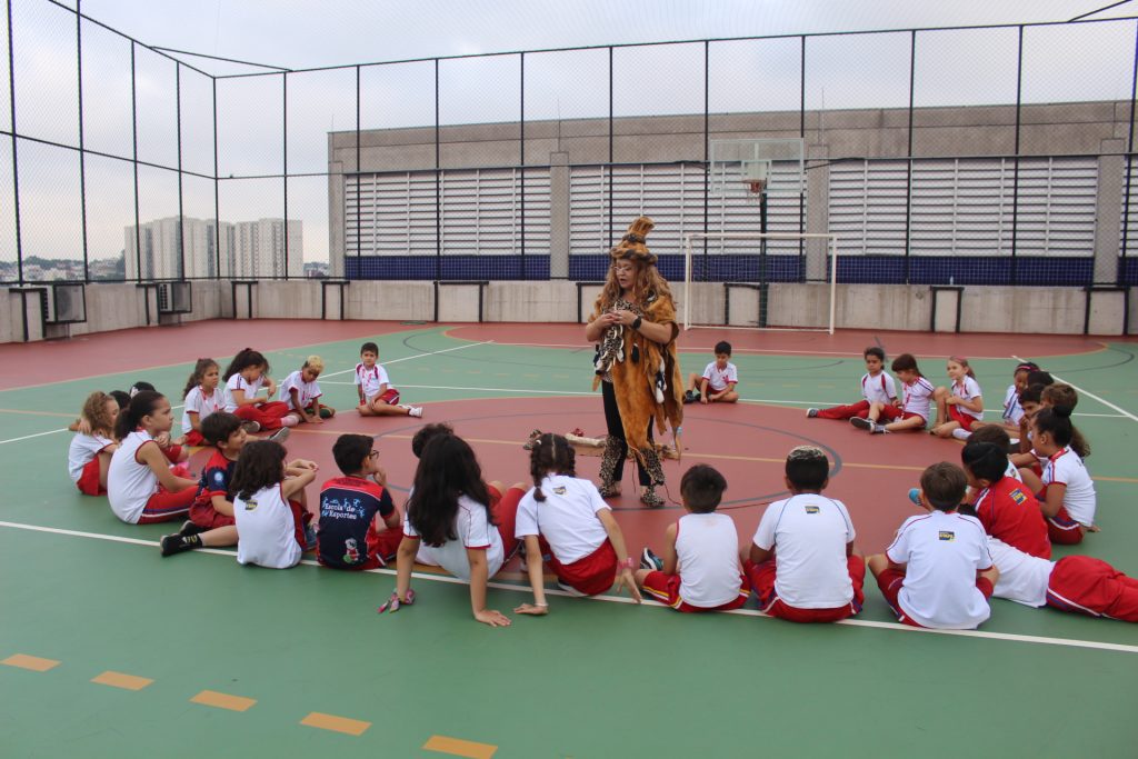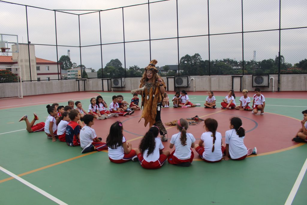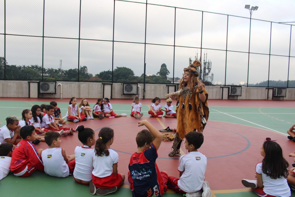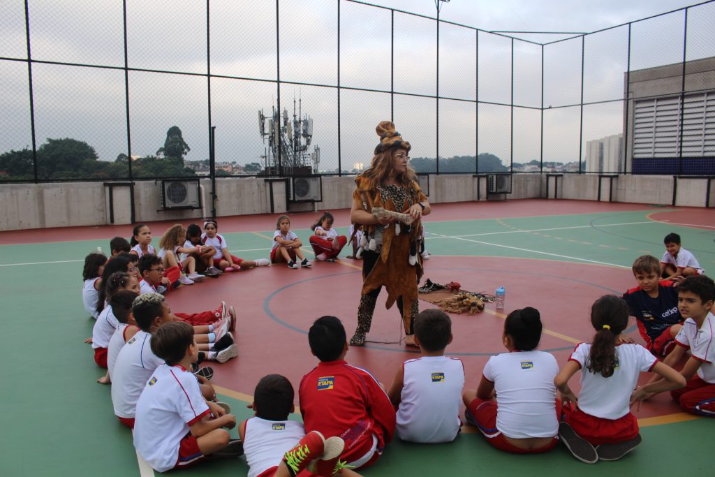 Para tornar a aula mais prazerosa e repleta de conhecimentos e curiosidades, contamos com a presença da mulher das cavernas. Com essa visita puderam ver de perto os tipos de vestimentas usadas que eram feitas de pele de animais, acessórios e adornos feitos de dente e chifre de animais, conheceram a semente de urucum e os registros rupestres que eram feitos. Naquela época, não existia um sistema de escrita e eles se comunicavam por gestos, grunhidos e registros nas paredes das cavernas.