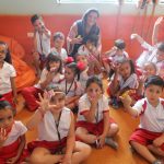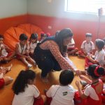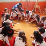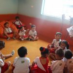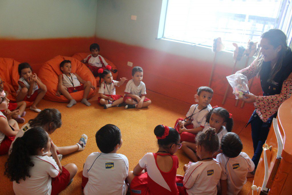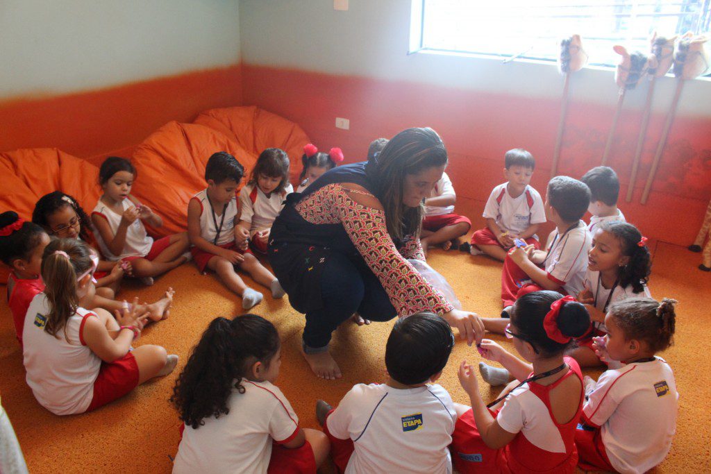 A aula no Jardim II B começou com uma música muito divertida, que falava de um menino chamado Manuel que estava brincando de passar um anel. Nesse contexto, os alunos deveriam adivinhar com quem estava anel…