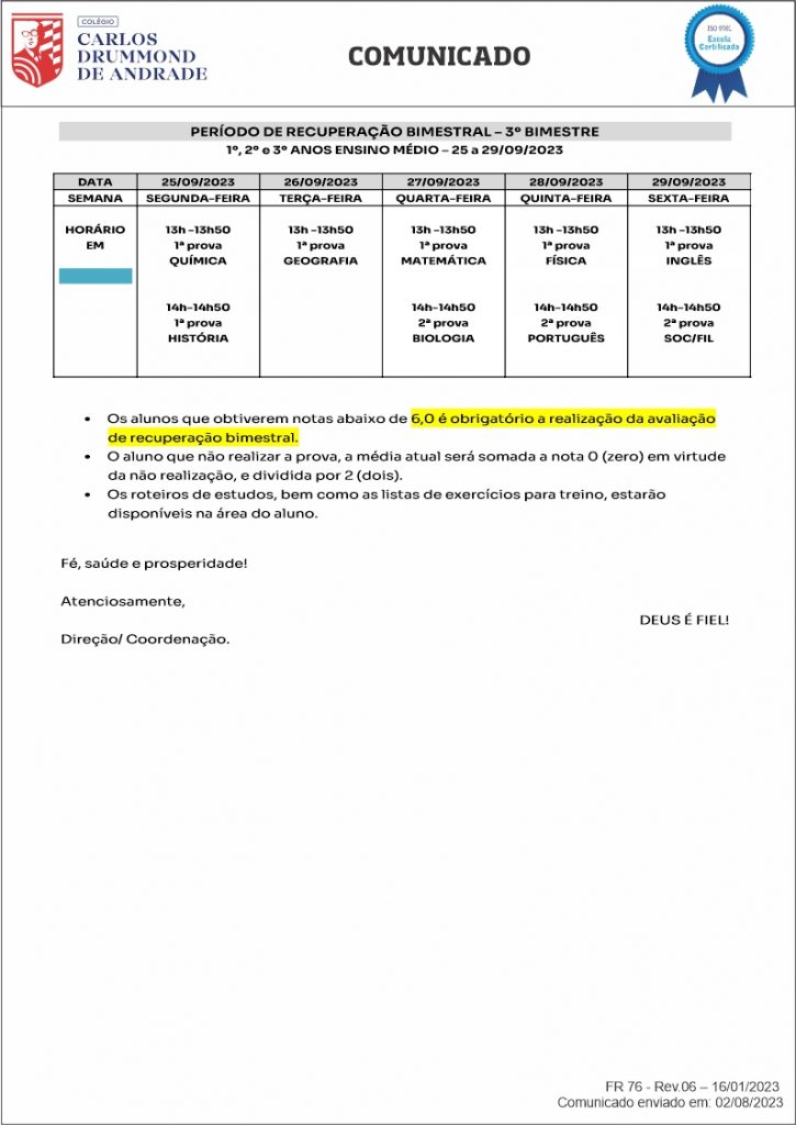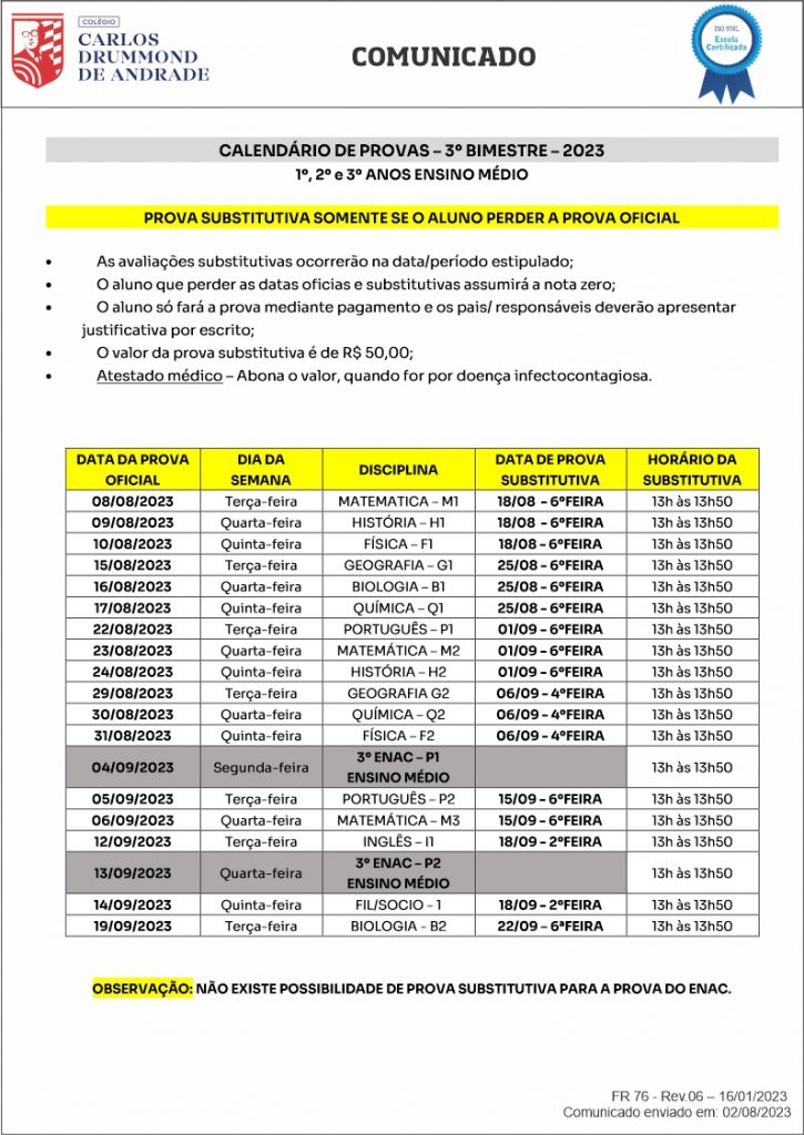 CALENDÁRIO DE PROVAS – 3º BIMESTRE ENSINO MÉDIO