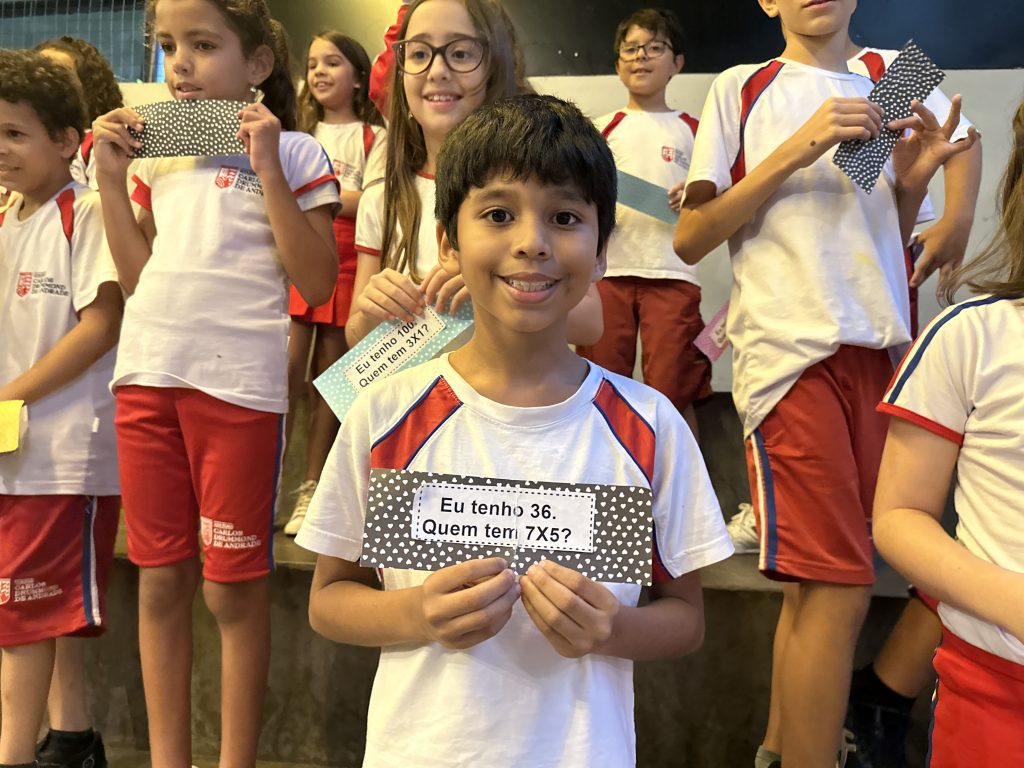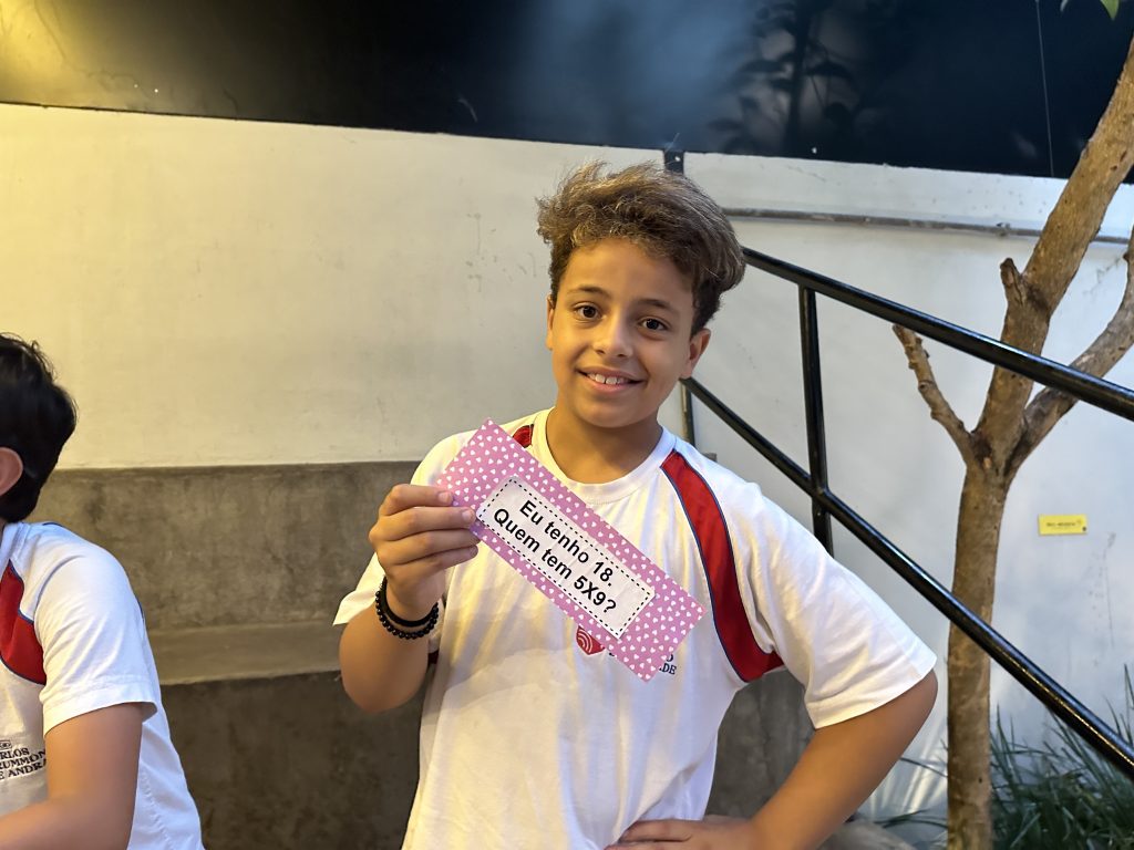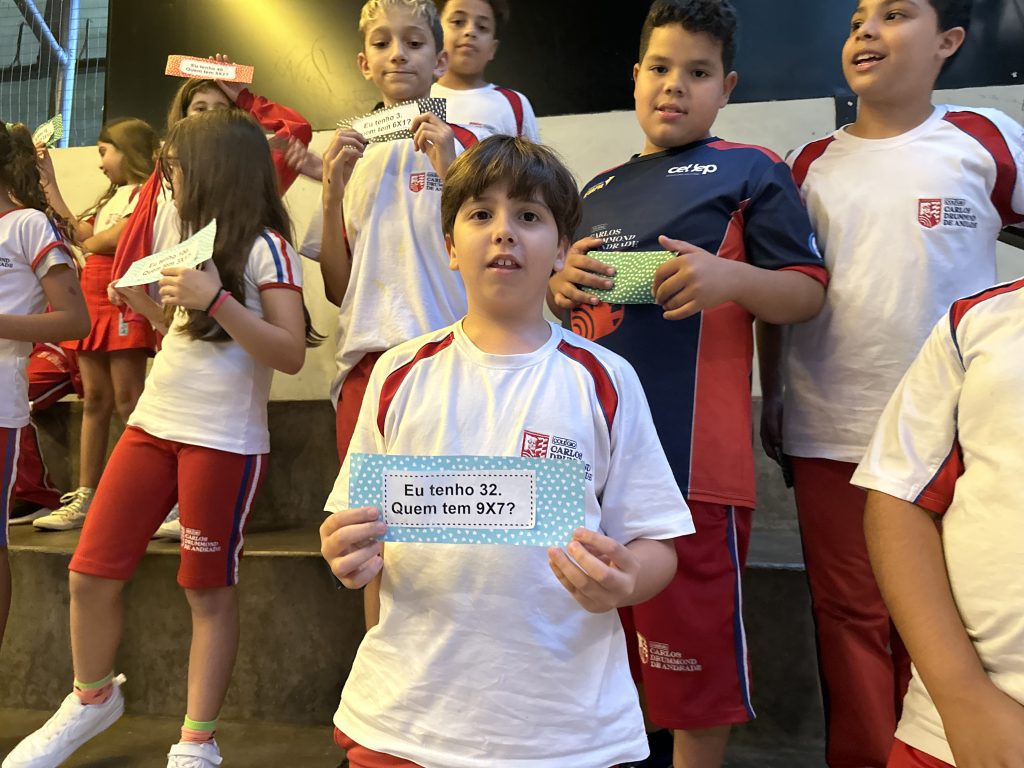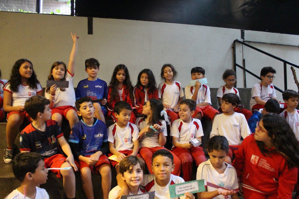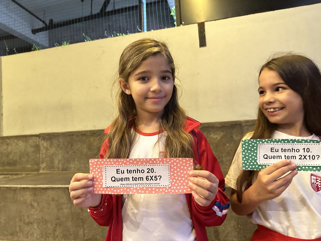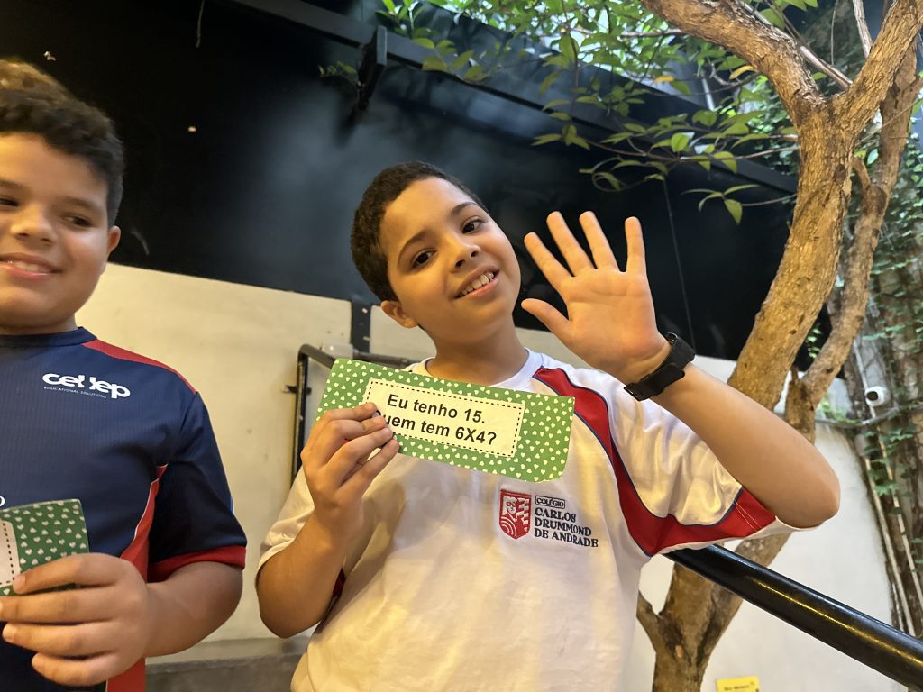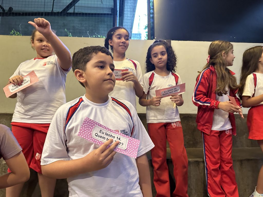 Em uma brincadeira divertida, cada aluno possuía em mãos uma ficha com um número e um cálculo, o aluno a iniciar deveria dizer seu número e perguntar quem era o dono do número resultante do cálculo em sua ficha. “Eu tenho 15. Quem tem 10×5?”. Assim era o formato do desafio, criando uma grande sequência a partir dos resultados. Os alunos deveriam ser rápidos o suficiente para calcular o resultado da conta e verificar se esse era o número em sua ficha.