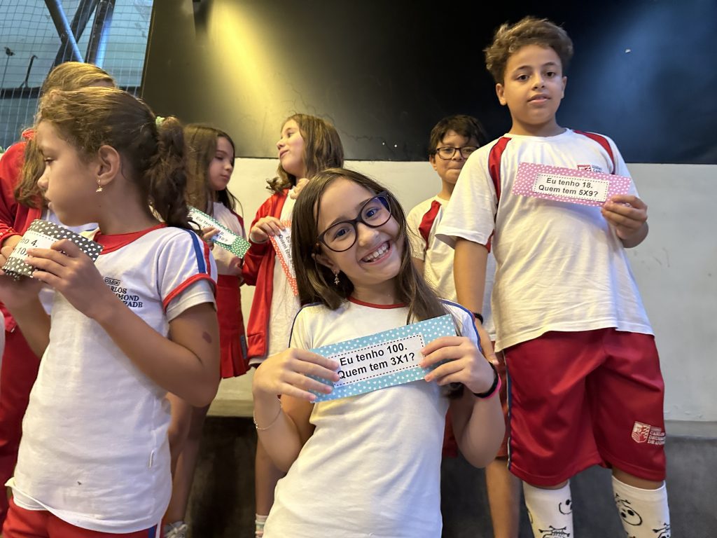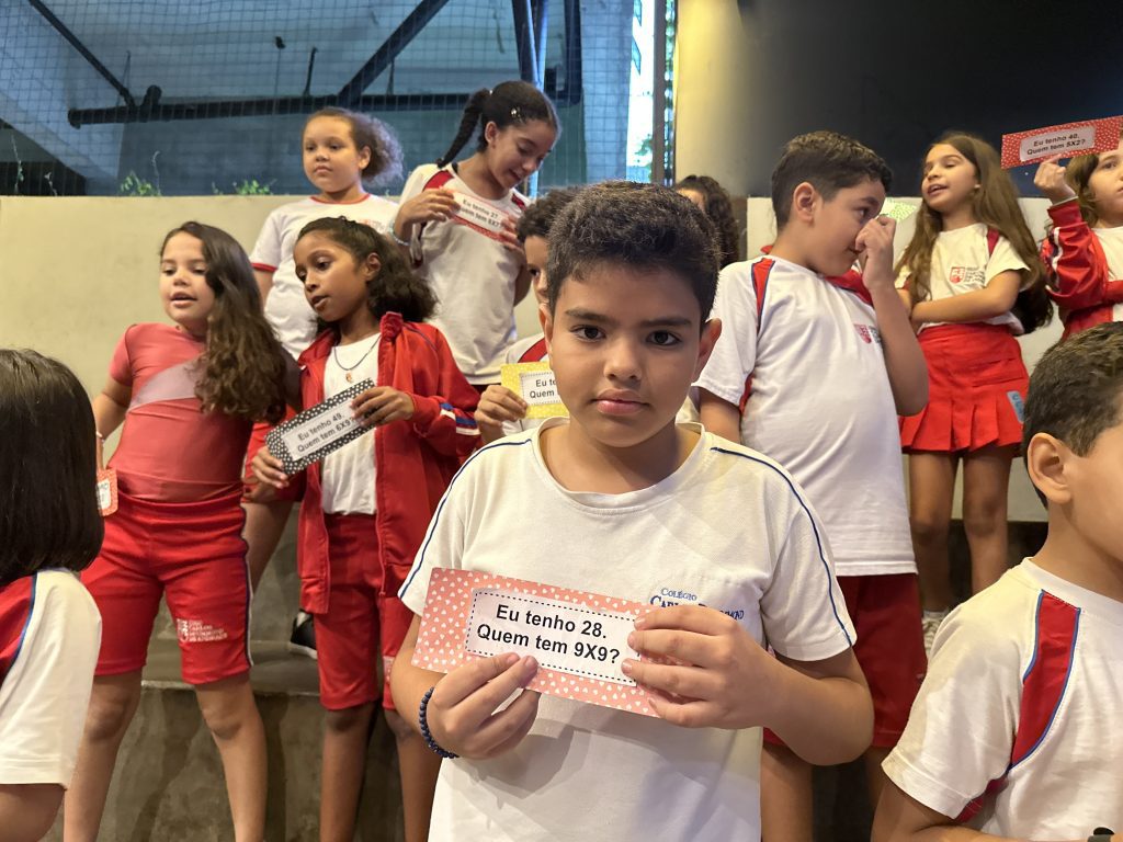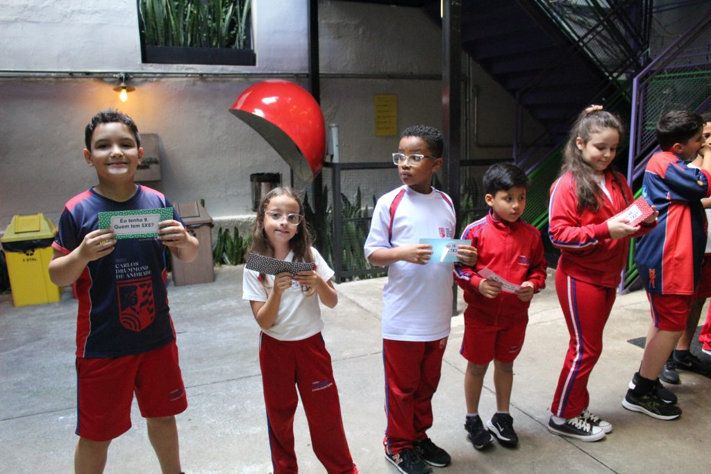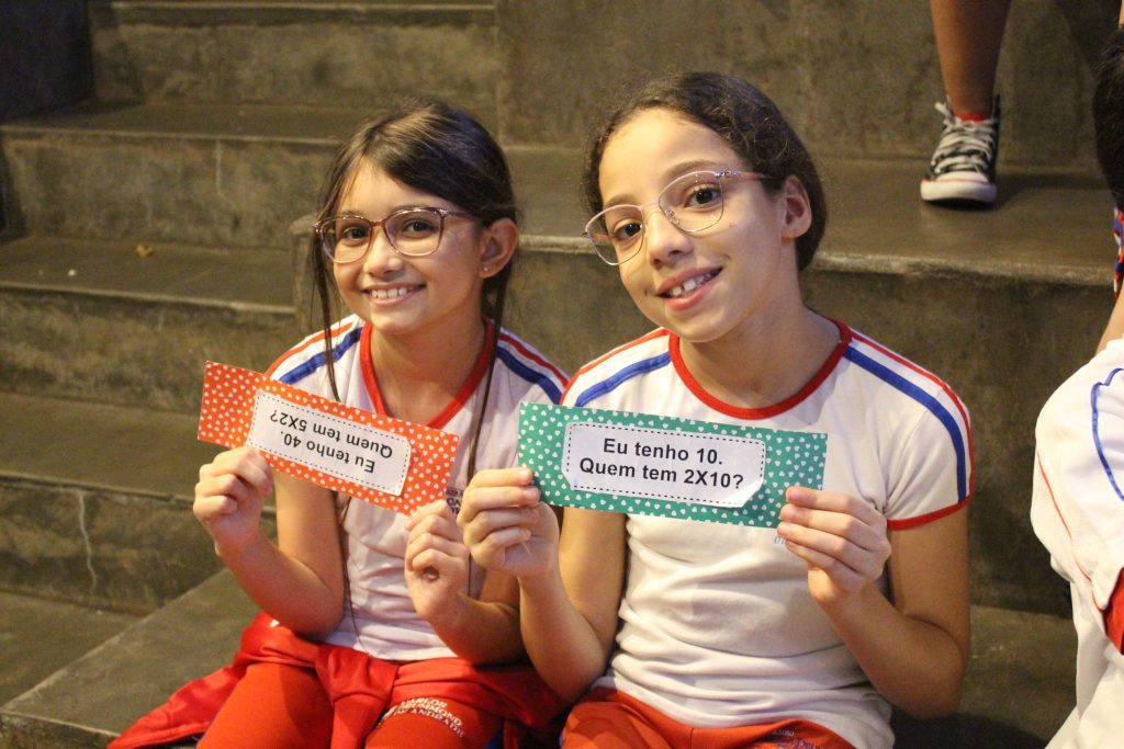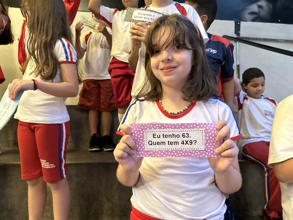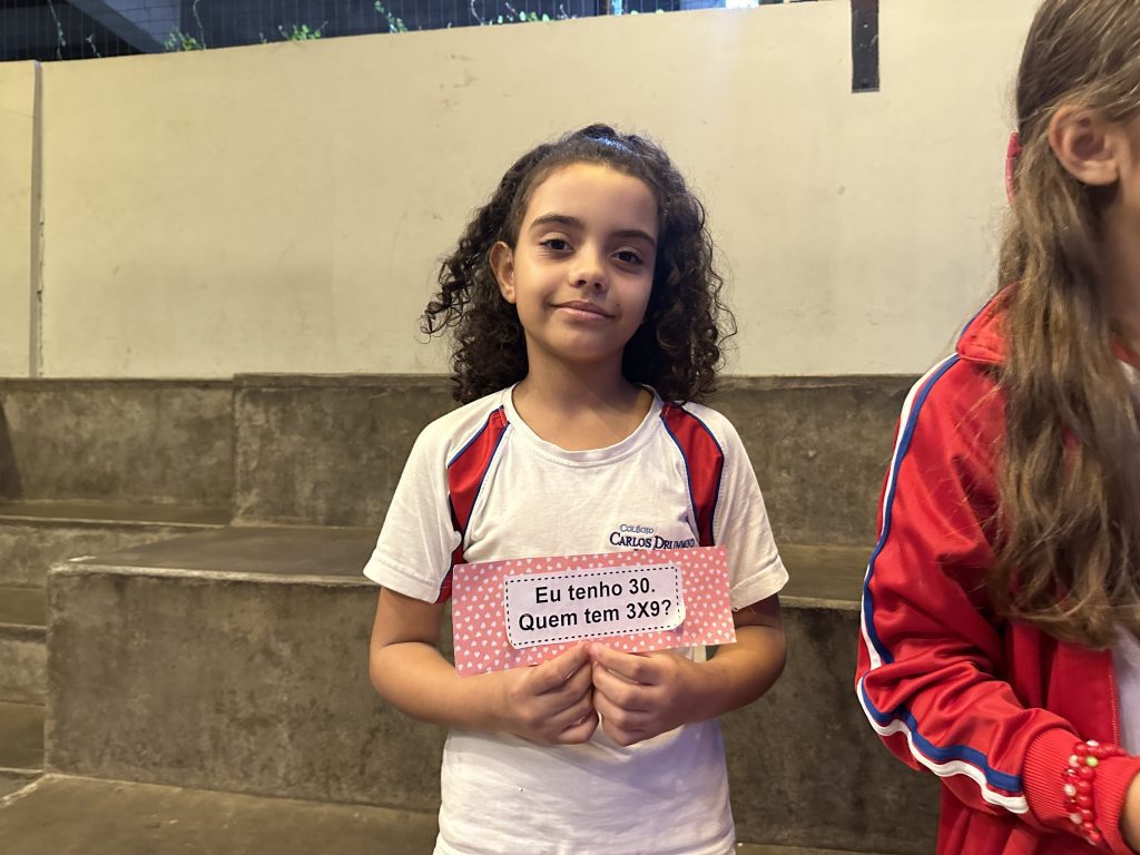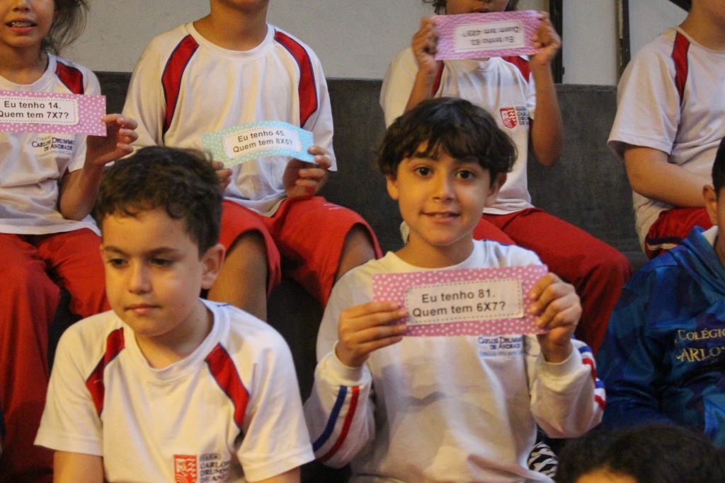 Em uma brincadeira divertida, cada aluno possuía em mãos uma ficha com um número e um cálculo, o aluno a iniciar deveria dizer seu número e perguntar quem era o dono do número resultante do cálculo em sua ficha. “Eu tenho 15. Quem tem 10×5?”. Assim era o formato do desafio, criando uma grande sequência a partir dos resultados. Os alunos deveriam ser rápidos o suficiente para calcular o resultado da conta e verificar se esse era o número em sua ficha.