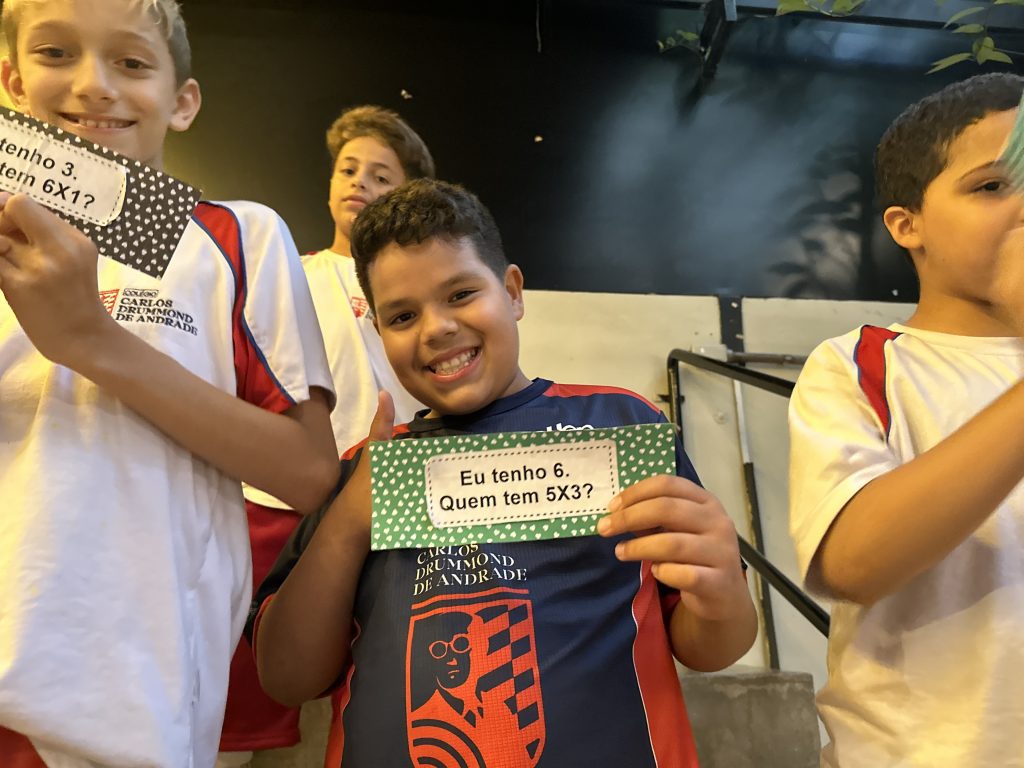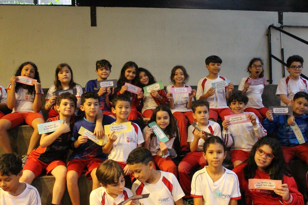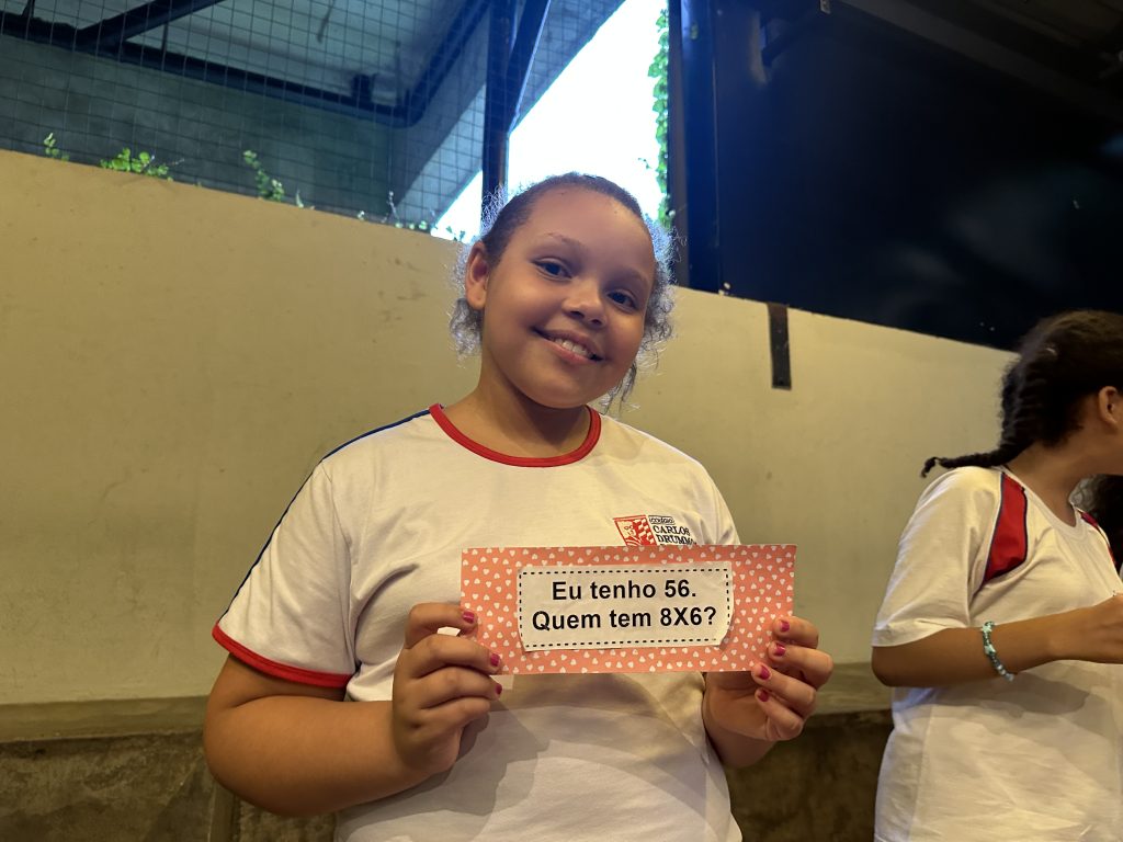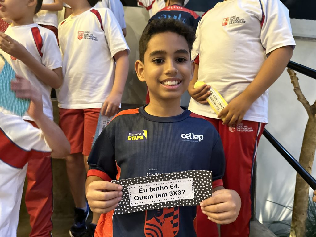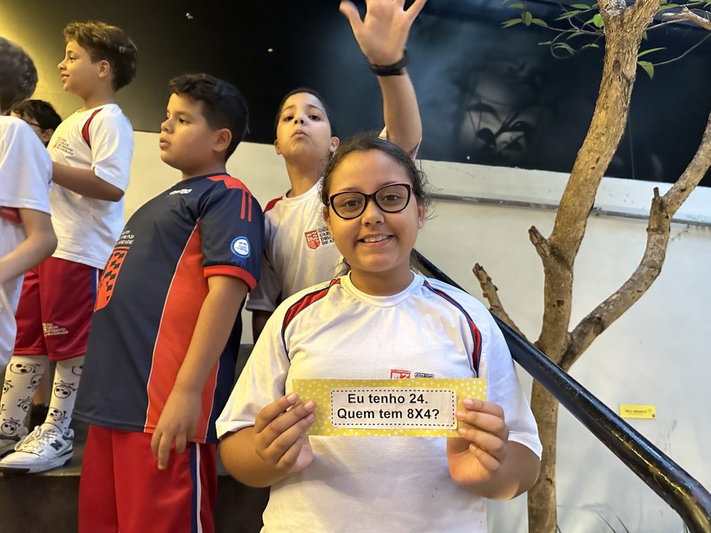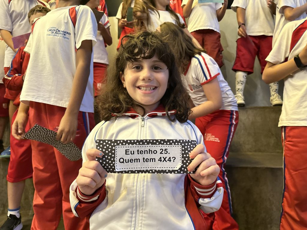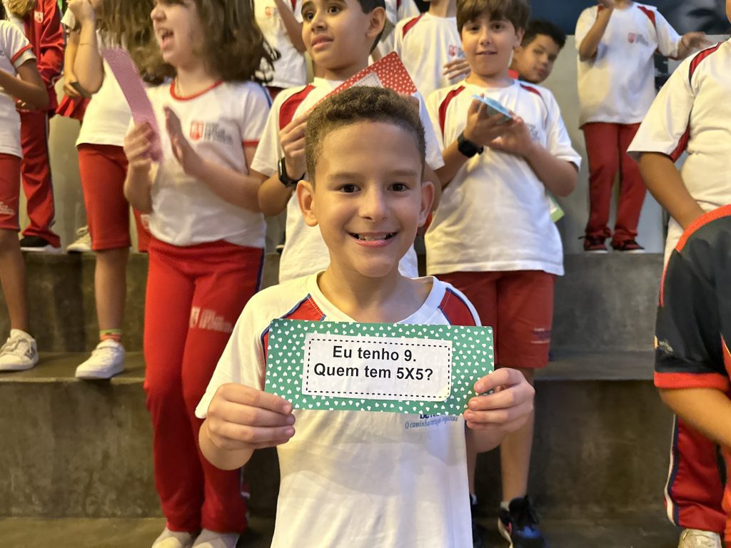 Em uma brincadeira divertida, cada aluno possuía em mãos uma ficha com um número e um cálculo, o aluno a iniciar deveria dizer seu número e perguntar quem era o dono do número resultante do cálculo em sua ficha. “Eu tenho 15. Quem tem 10×5?”. Assim era o formato do desafio, criando uma grande sequência a partir dos resultados. Os alunos deveriam ser rápidos o suficiente para calcular o resultado da conta e verificar se esse era o número em sua ficha.