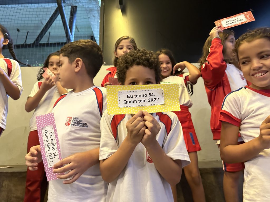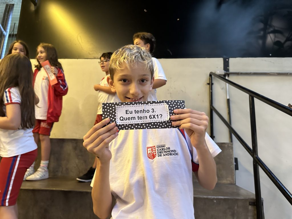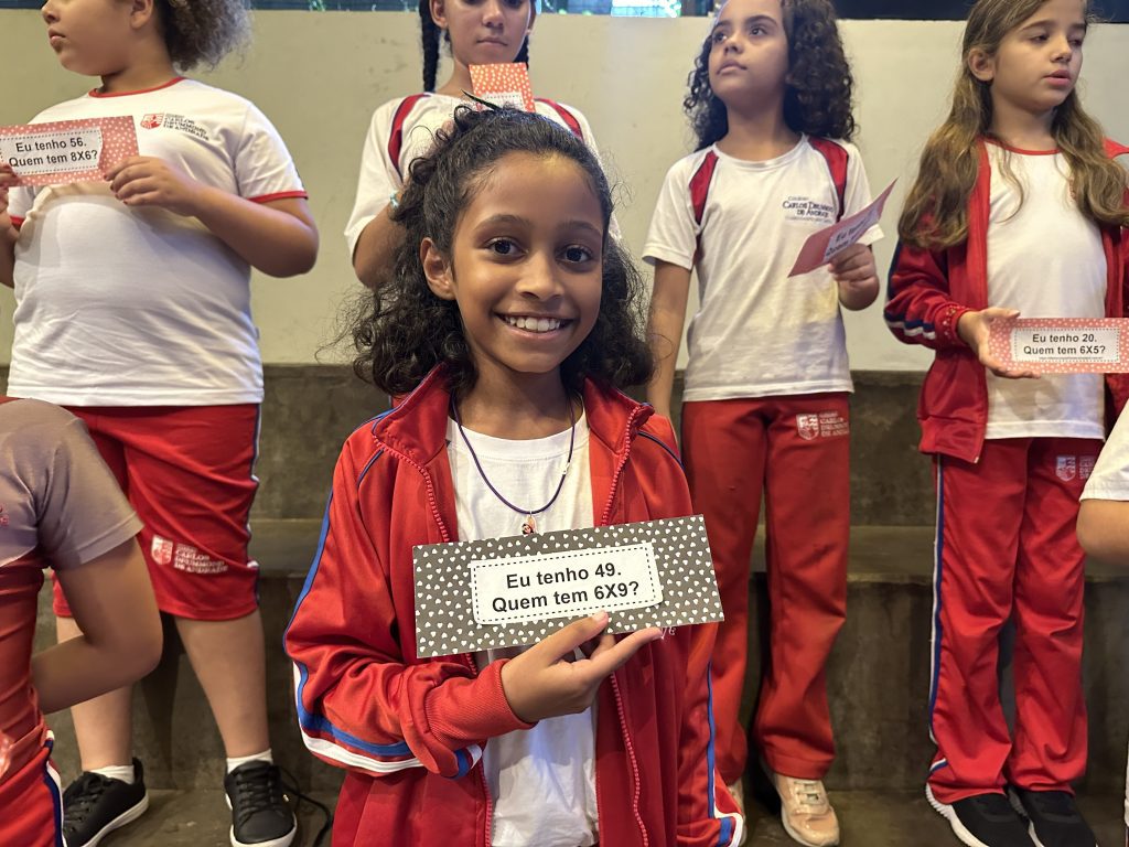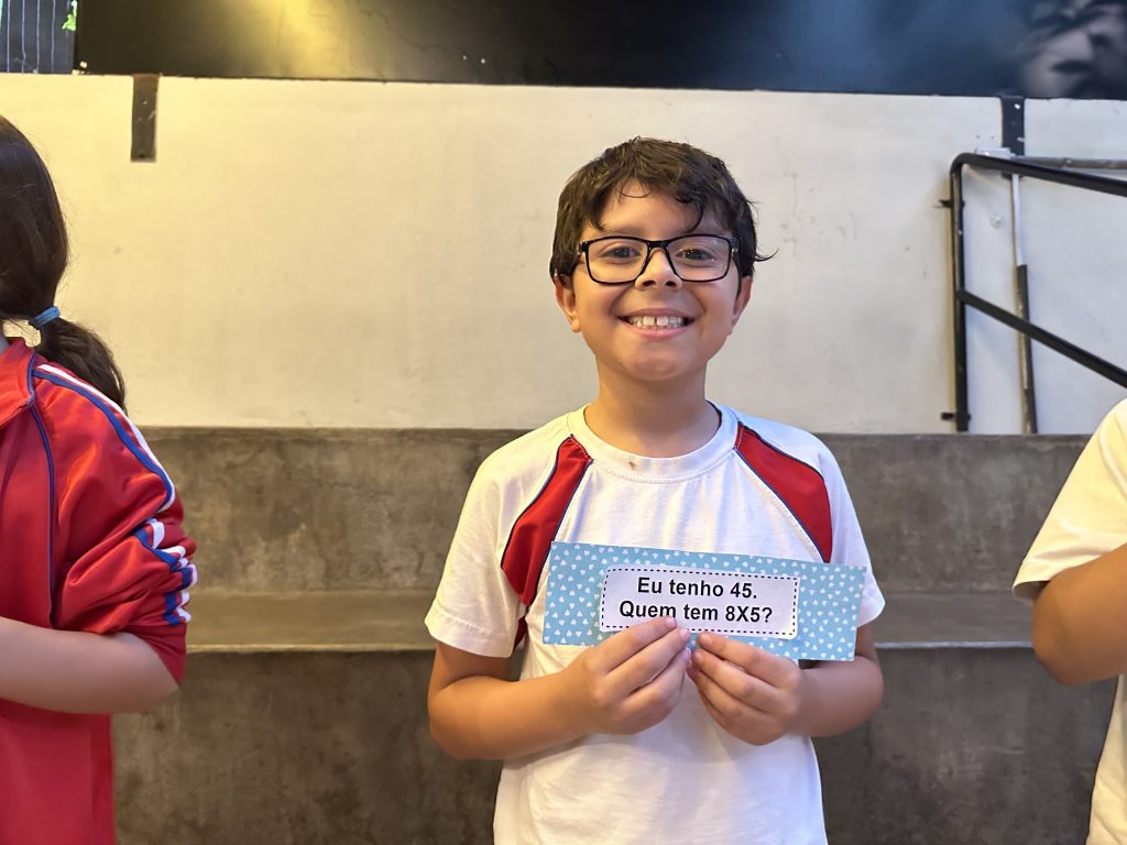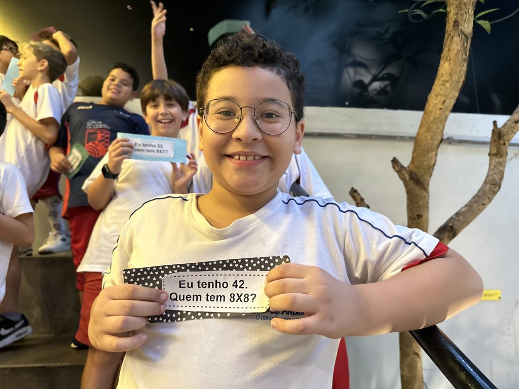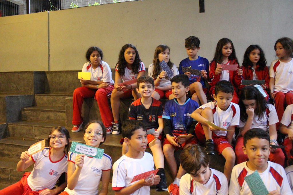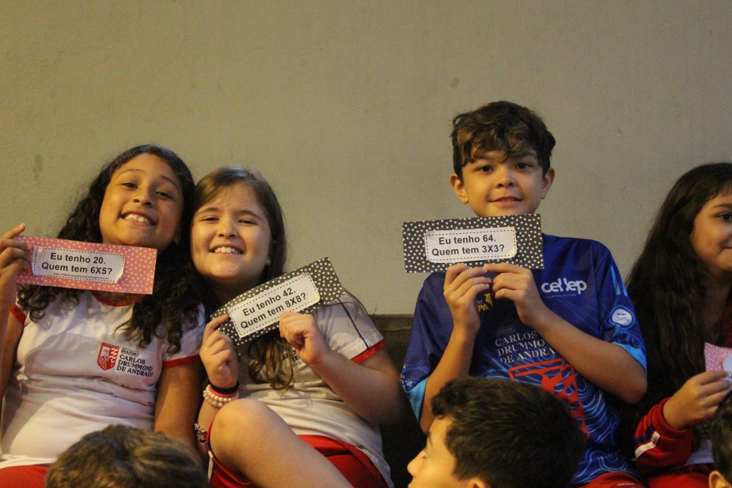 Em uma brincadeira divertida, cada aluno possuía em mãos uma ficha com um número e um cálculo, o aluno a iniciar deveria dizer seu número e perguntar quem era o dono do número resultante do cálculo em sua ficha. “Eu tenho 15. Quem tem 10×5?”. Assim era o formato do desafio, criando uma grande sequência a partir dos resultados. Os alunos deveriam ser rápidos o suficiente para calcular o resultado da conta e verificar se esse era o número em sua ficha.