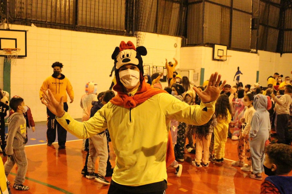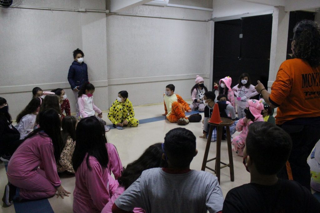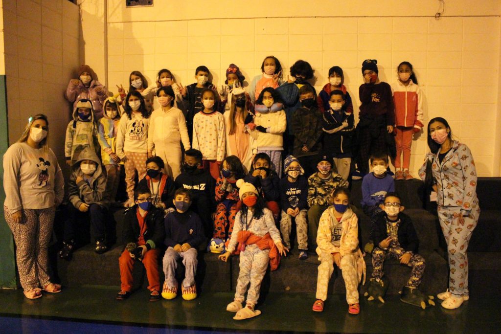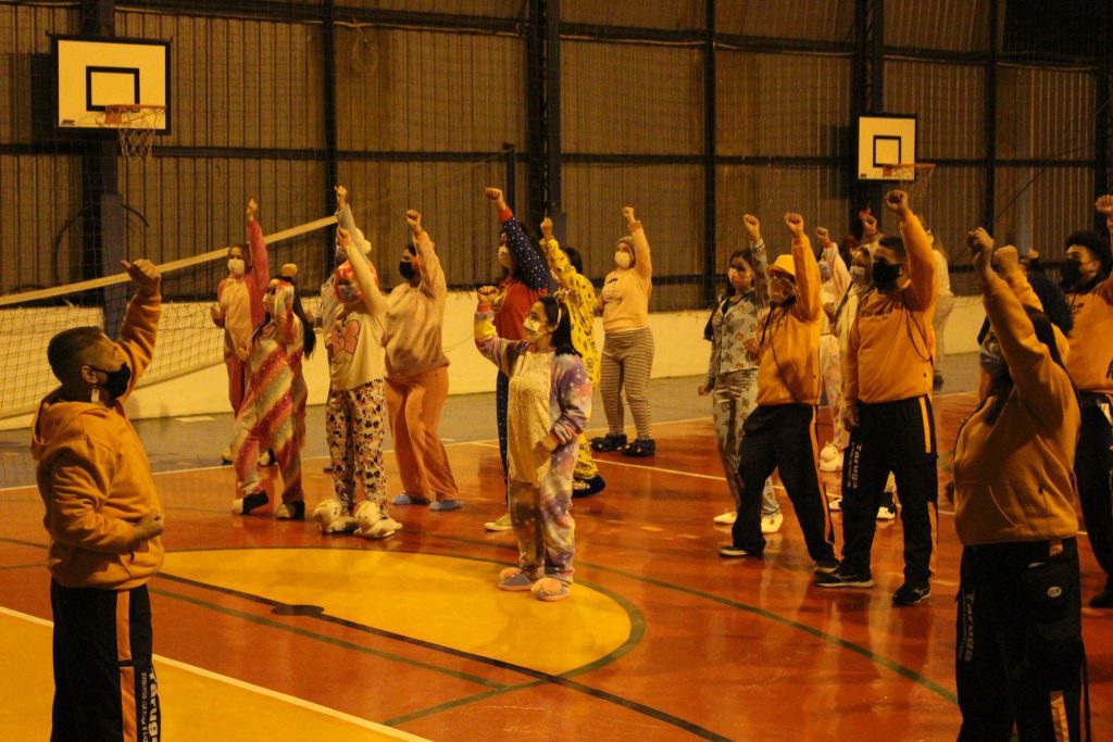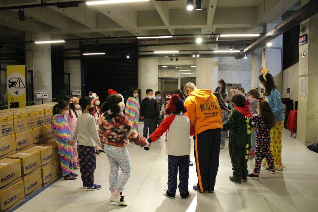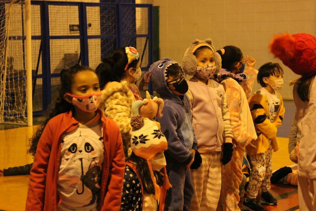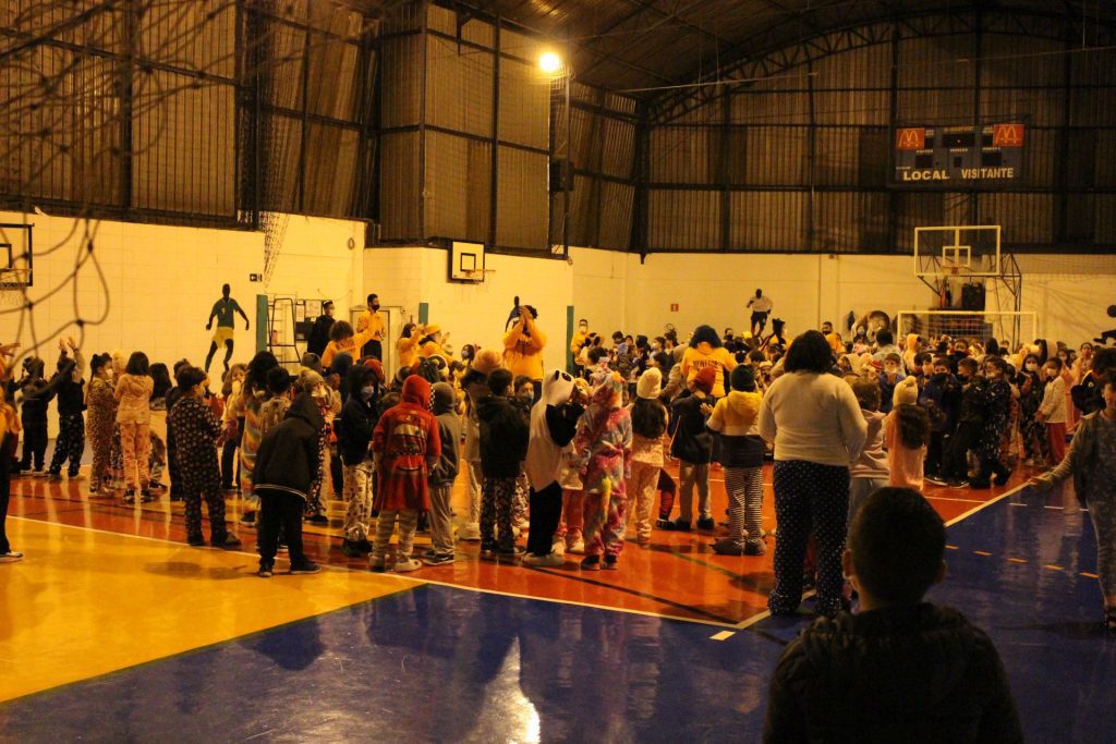 Os alunos foram recepcionados e direcionados ao Ginásio Poliesportivo para dar início à festa com uma dinâmica de boas-vindas muito animada. E as crianças, é claro, vieram com seus lindos pijamas para entrar no ritmo do Drummond Night.