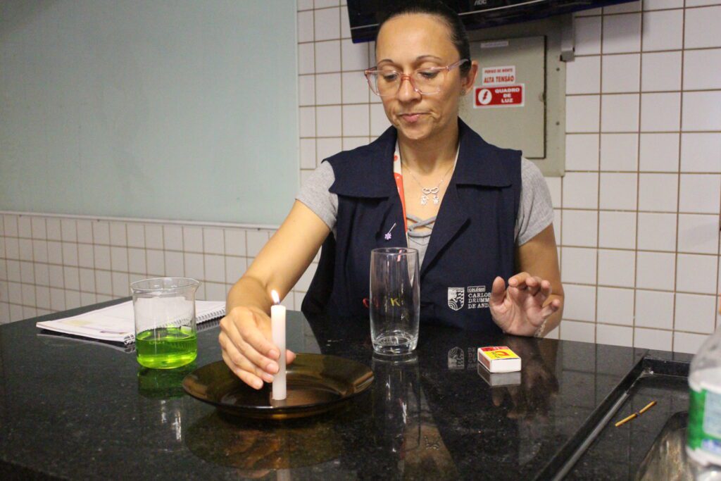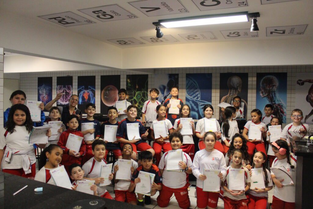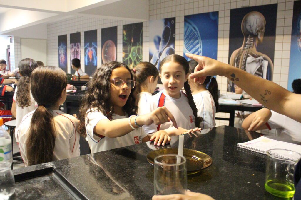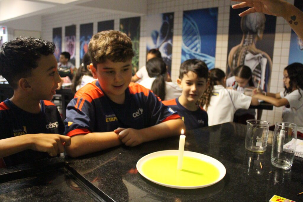 Os alunos do 4º ano do Ensino Fundamental I participaram de uma atividade prática no laboratório para compreender os efeitos dos gases e o processo de combustão. Por meio de um experimento simples e curioso, observaram como a presença do oxigênio é essencial para a manutenção da chama e como a variação de pressão influencia o comportamento do ar e dos líquidos.