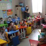 Na folha de atividades, os alunos puderam perceber que a palavra “Elefante” inicia com a vogal E. Todos conheceram e treinaram o traçado desta vogal que está presente em muitas palavrinhas.