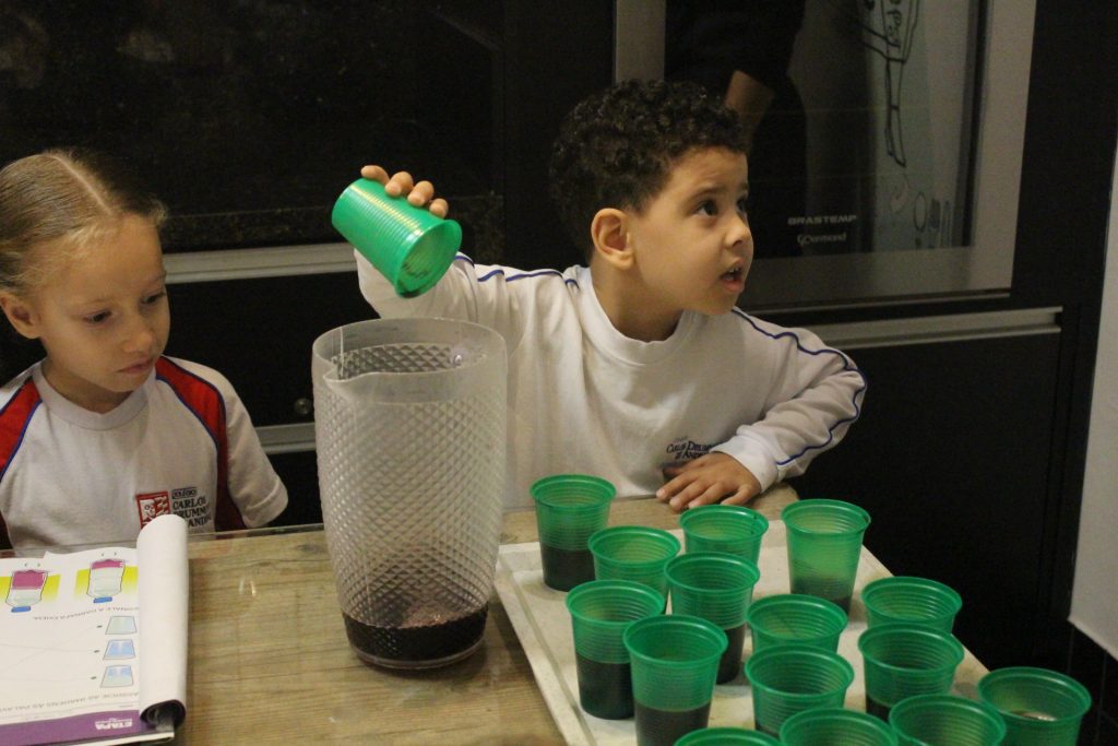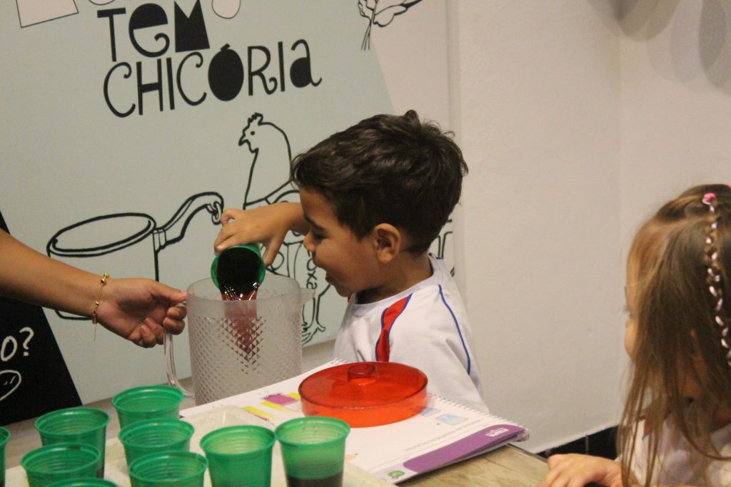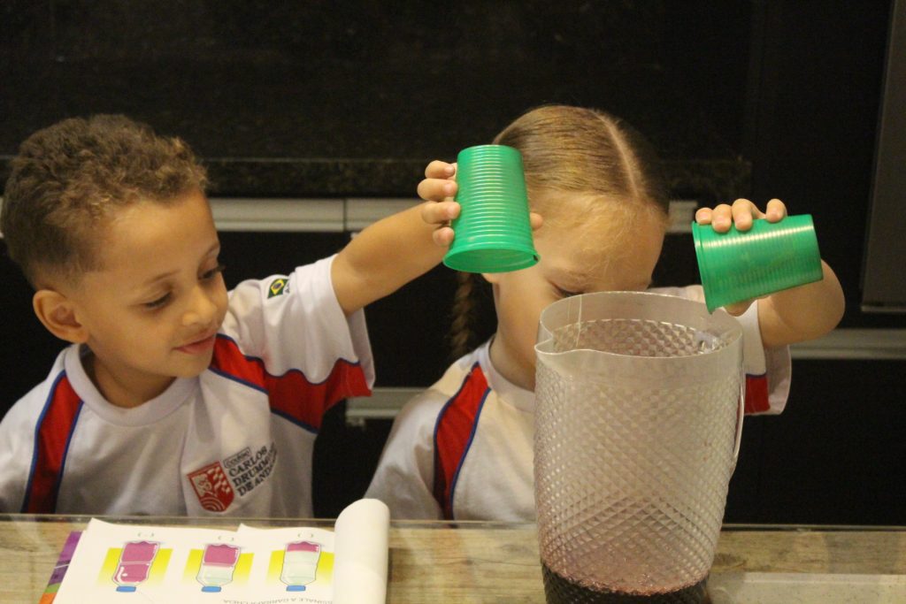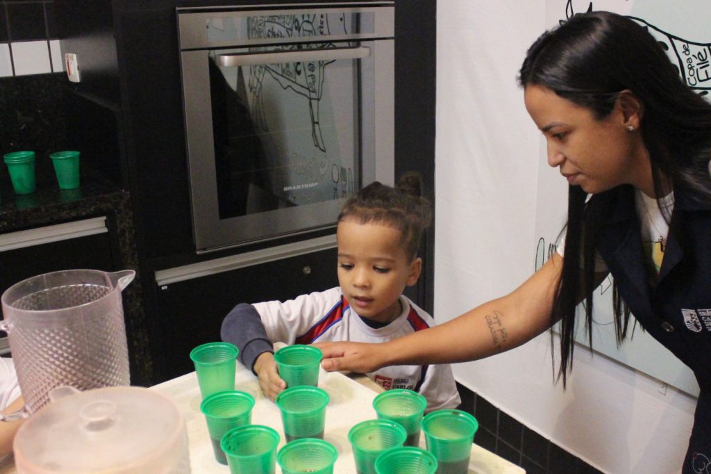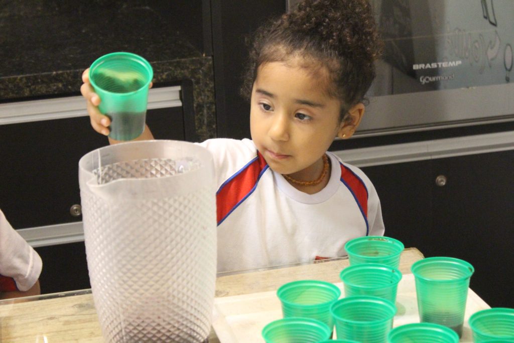 Os alunos do Jardim IA e Jardim IB participaram de uma atividade especial na Cozinha Experimental para reforçar, de forma prática e divertida, os conceitos trabalhados em sala de aula sobre medidas e quantidades. A proposta foi explorar de maneira concreta as noções de “cheio”, “vazio” e “metade”.