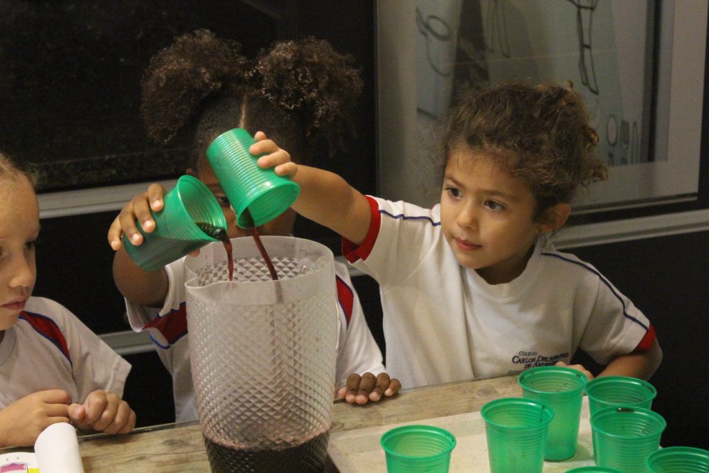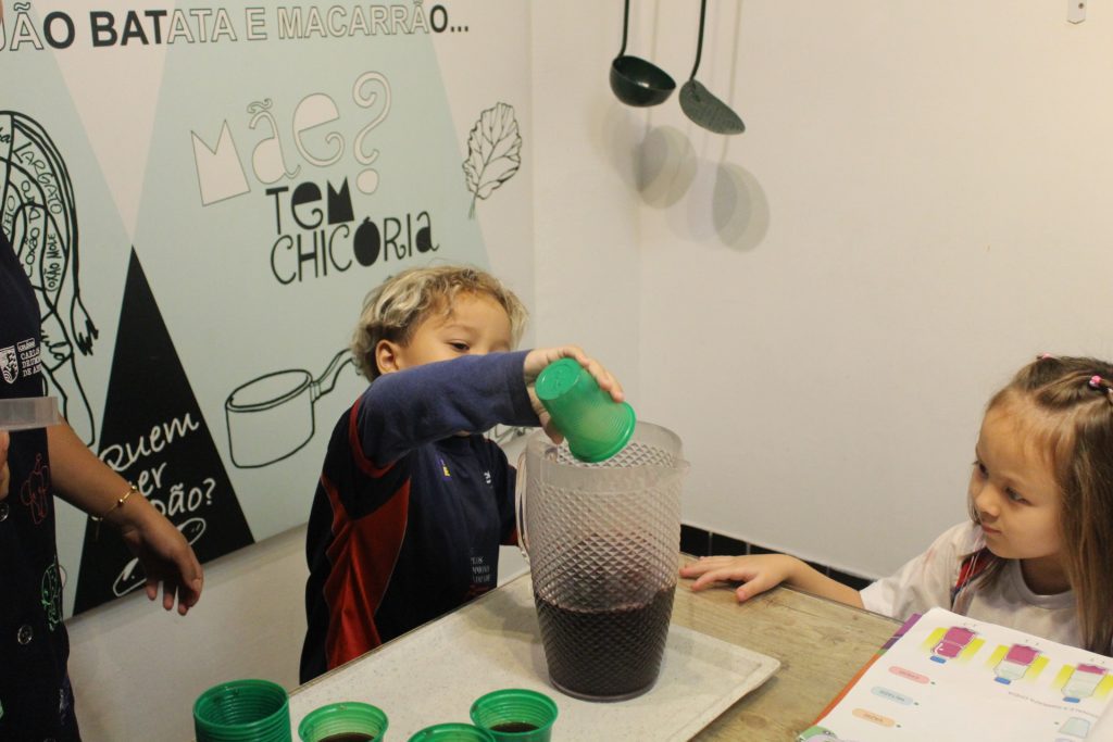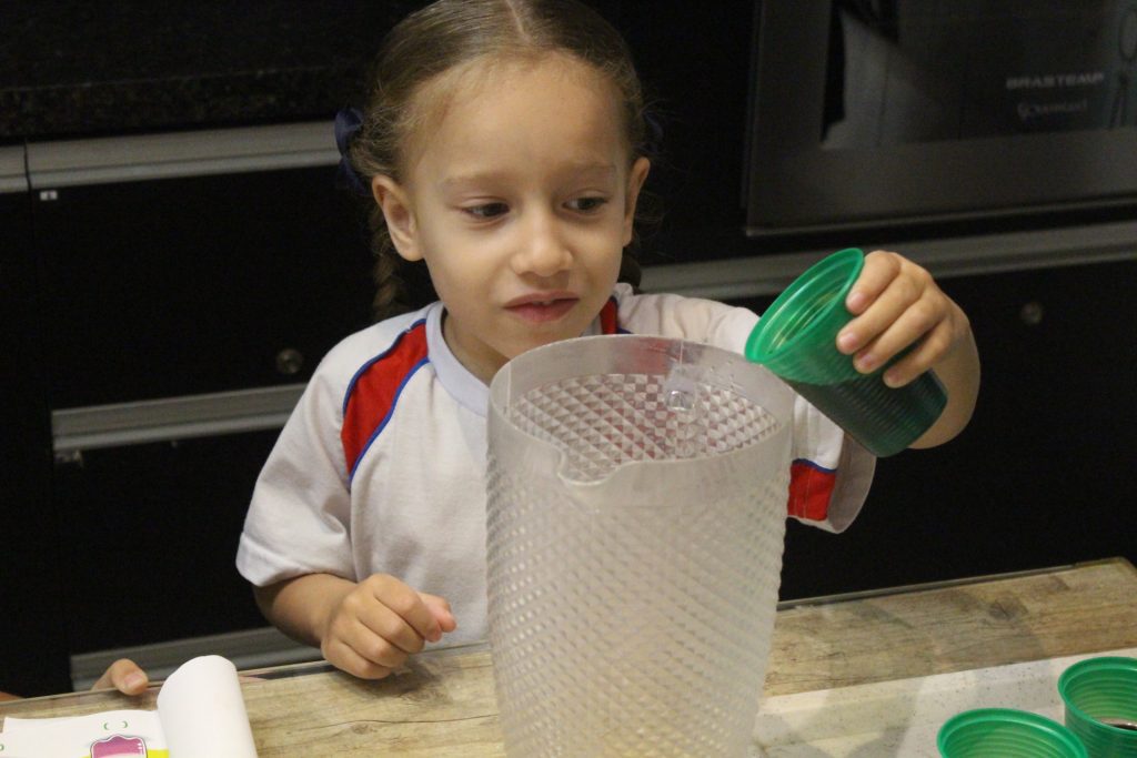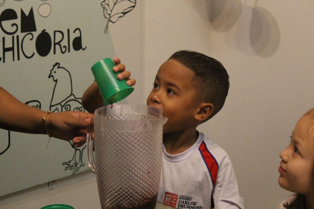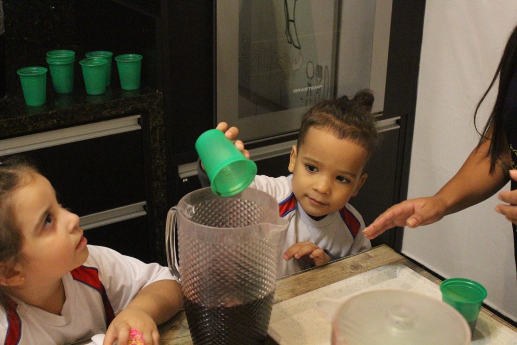 Durante a experiência, cada criança teve a oportunidade de encher um pouco a jarra com suco de uva. Com atenção e entusiasmo, observaram e identificaram o nível do líquido, reconhecendo visualmente se a jarra estava cheia, vazia ou pela metade.
