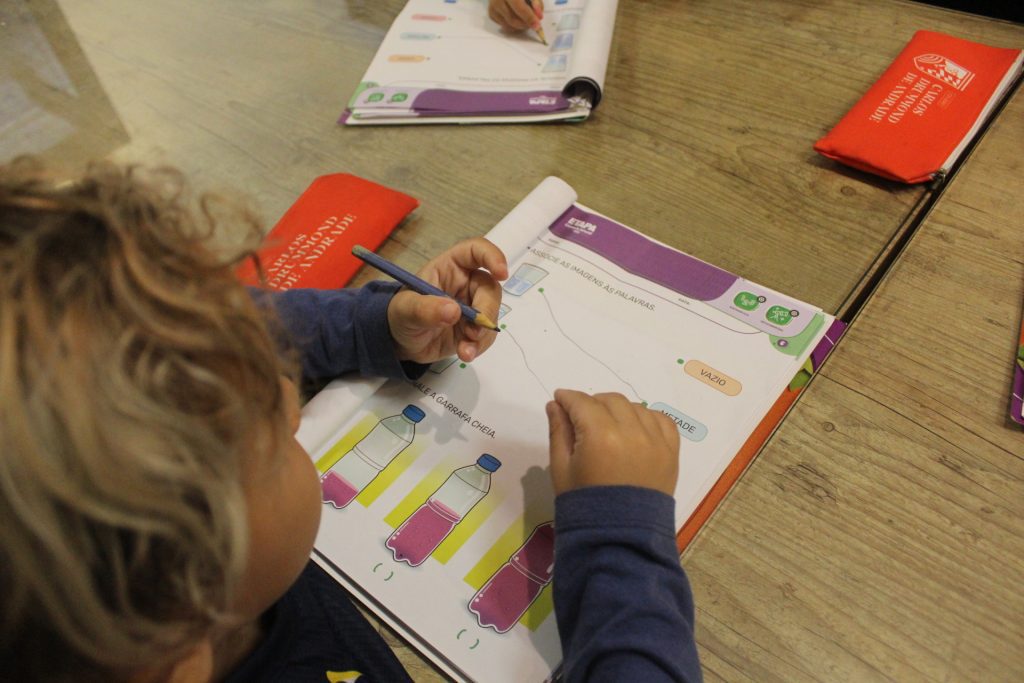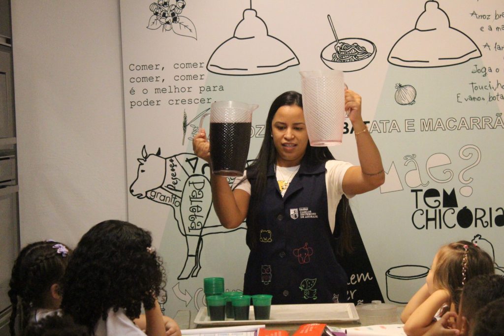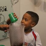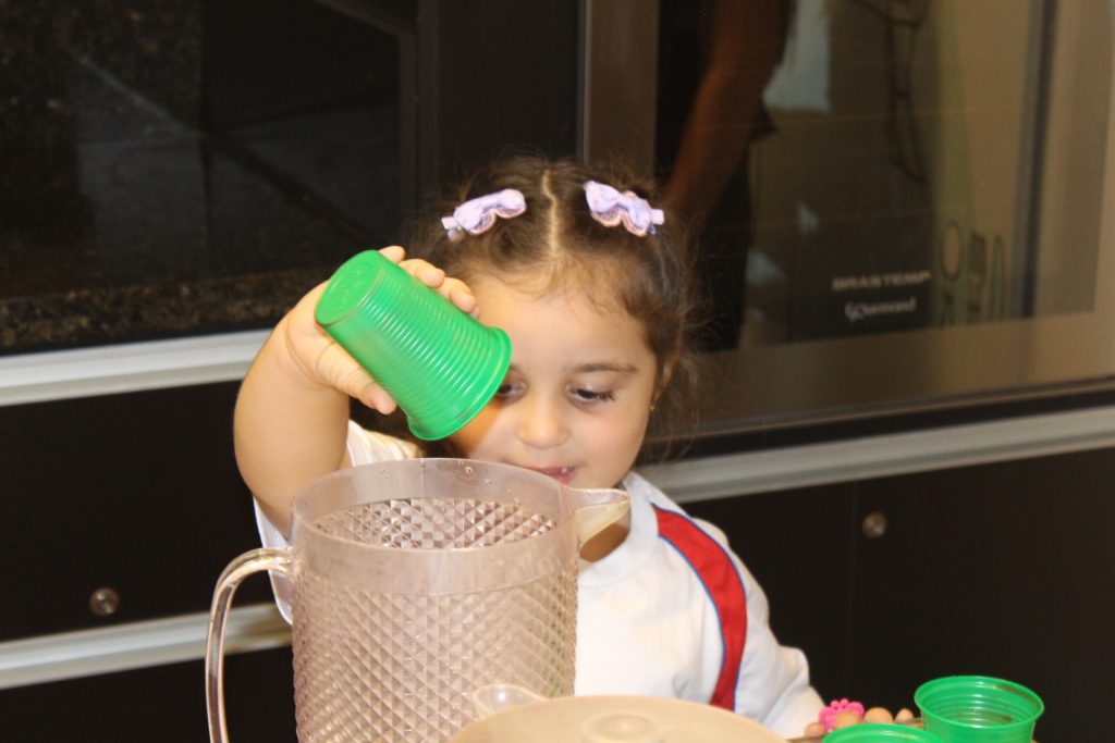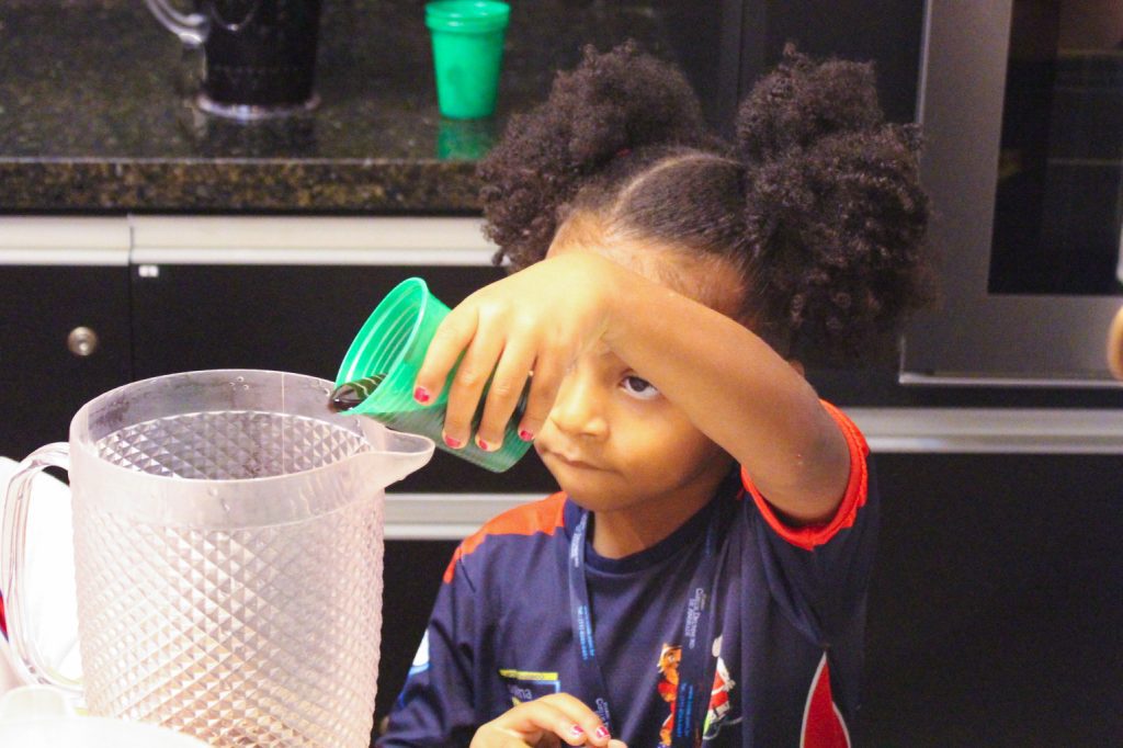 Durante a experiência, cada criança teve a oportunidade de encher um pouco a jarra com suco de uva. Com atenção e entusiasmo, observaram e identificaram o nível do líquido, reconhecendo visualmente se a jarra estava cheia, vazia ou pela metade.