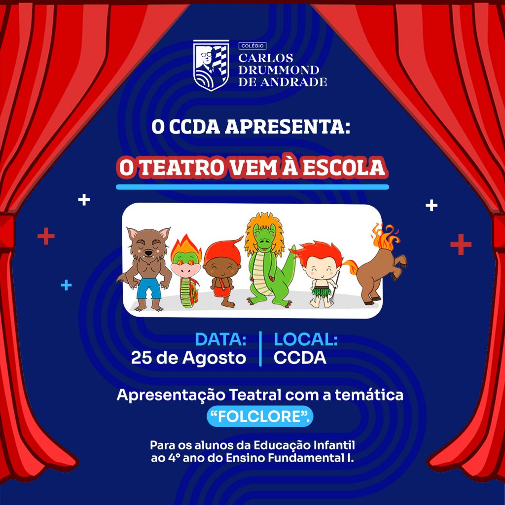 O CCDA apresenta: a magia do teatro na escola! Celebrando o mês do Folclore, vem aí mais uma atividade empolgante, que irá despertar a imaginação de nossos alunos. No dia 25 de Agosto, os alunos da Educação Infantil ao 4° ano do Ensino fundamental I prestigiarão uma incrível apresentação teatral com o tema “Folclore”.
