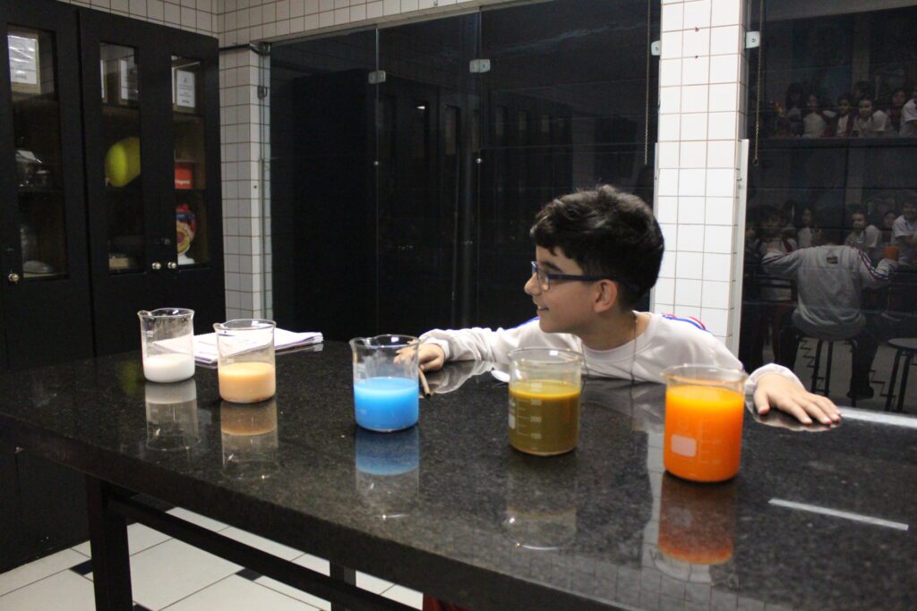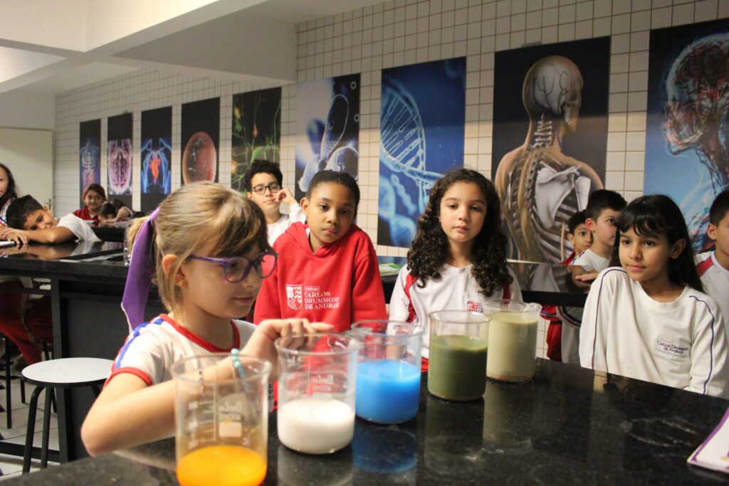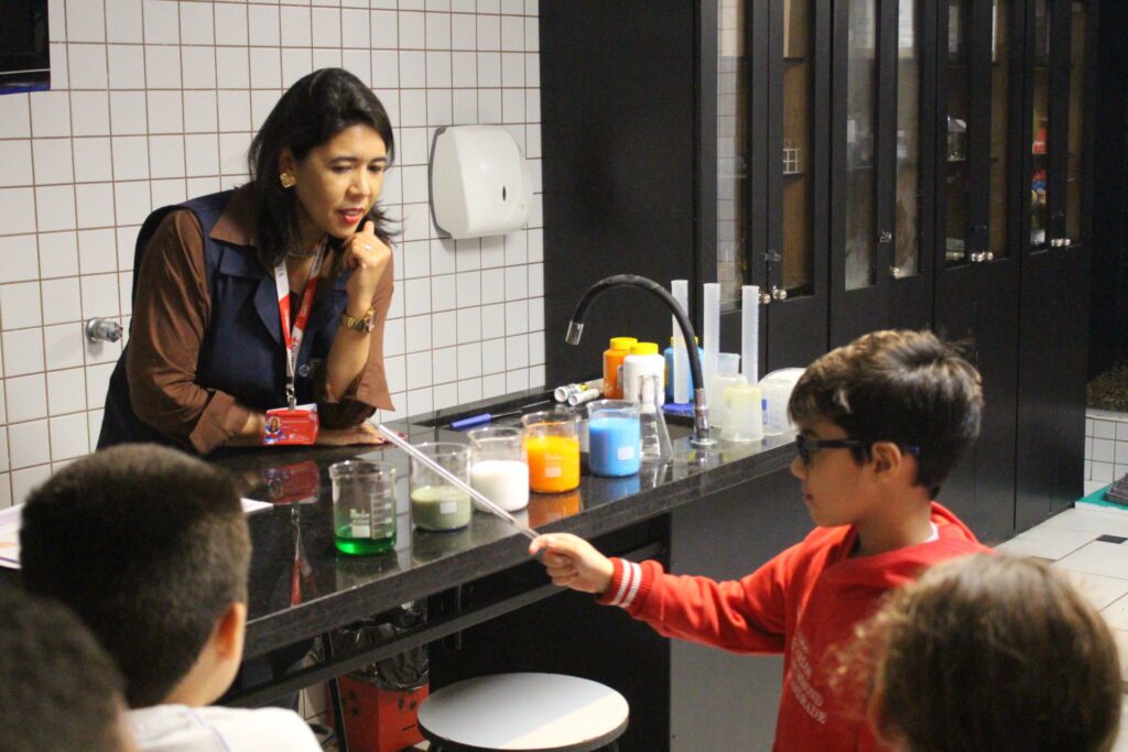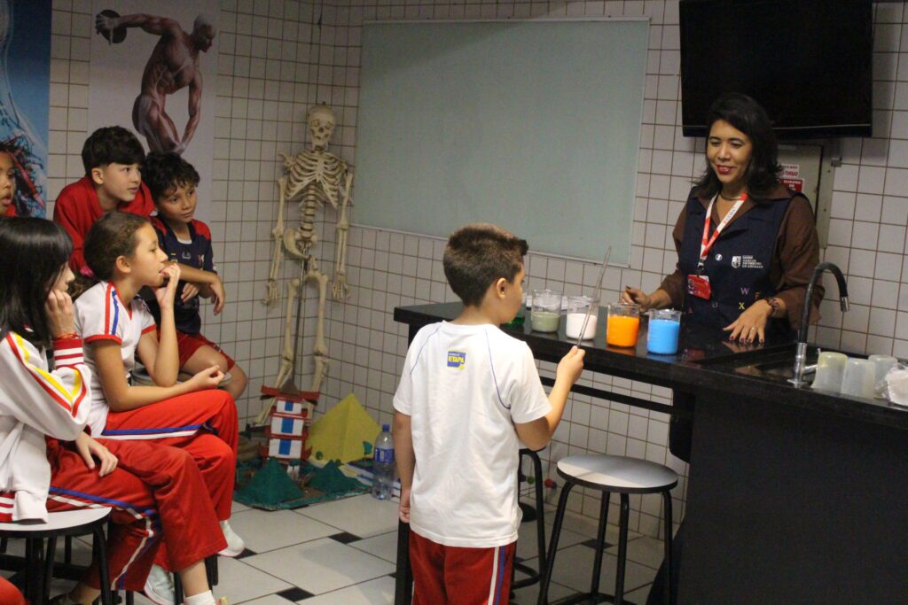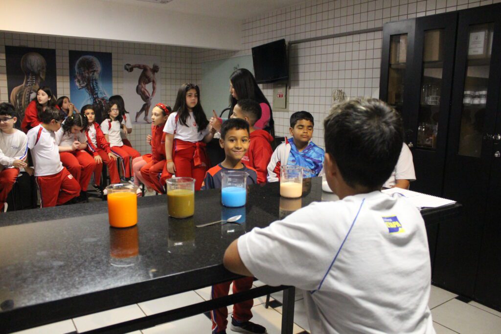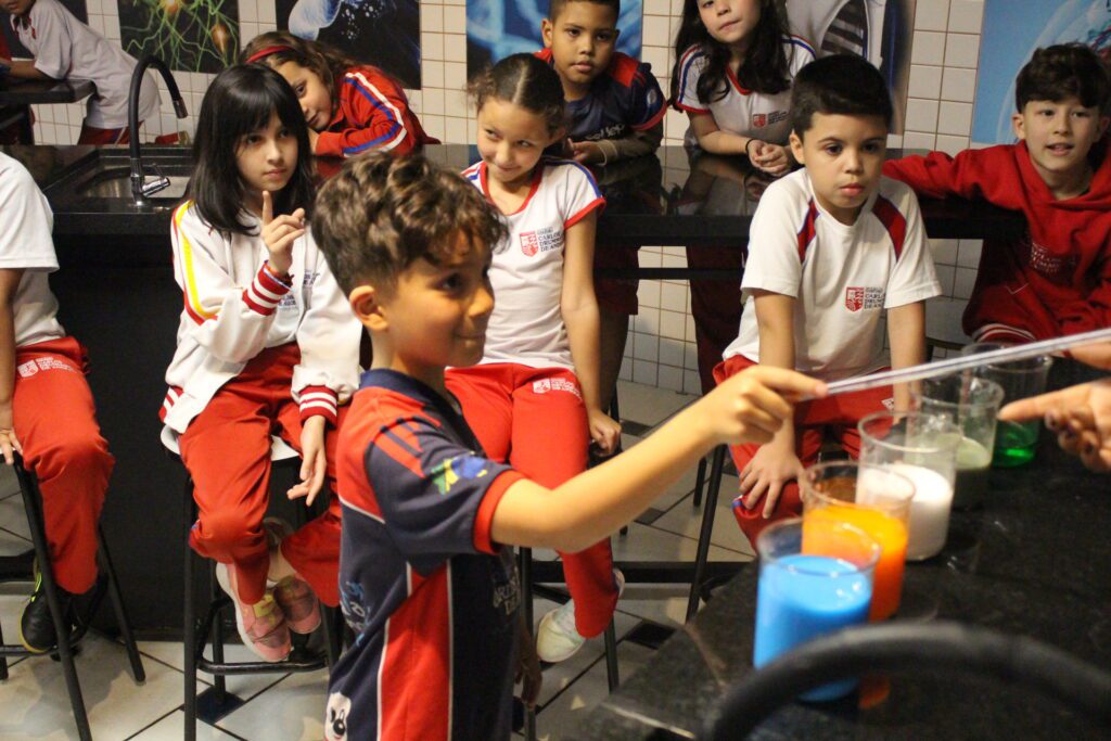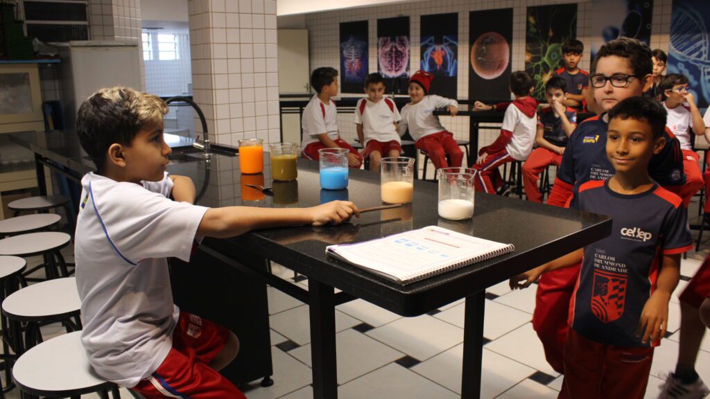 Os alunos do 3º ano do Ensino Fundamental participaram de uma atividade prática muito especial no nosso Laboratório, explorando as propriedades do som. A atividade aconteceu com o uso de recipientes com diferentes quantidades de água, que ao serem tocados produziam sons variados. Desta forma, os alunos puderam perceber que o copo mais cheio gerava um som mais grave, enquanto o copo mais vazio produzia um som mais agudo.