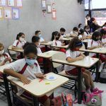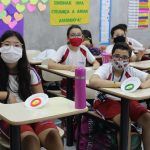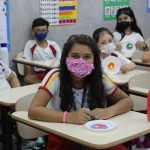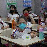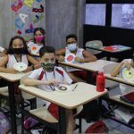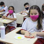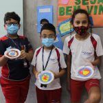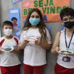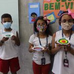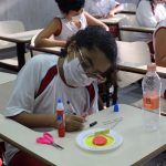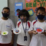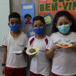 Cada aluno recebeu três cores distintas de massinha e assim, puderam construir e relembrar a função de cada estrutura, nomeando-as com legendas: membrana plasmática, citoplasma e núcleo.