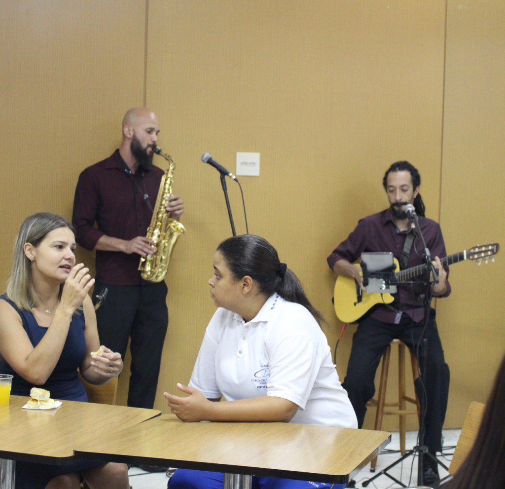 Iniciaram o dia com um delicioso café, oferecido pela Direção do CCDA, com uma novidade: uma dupla afinadíssima de cantores presenteou os docentes com o mais variado repertório da nossa MPB. Momento gostoso e tranquilo, que transferiu para todos uma energia positiva e contagiante.