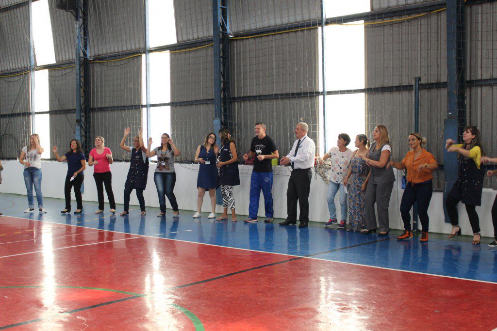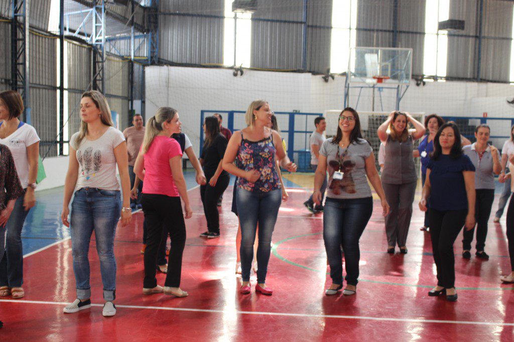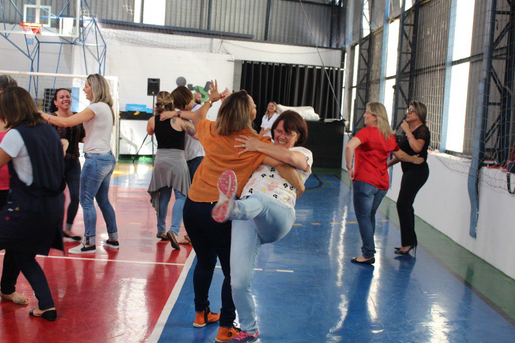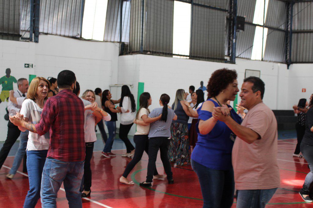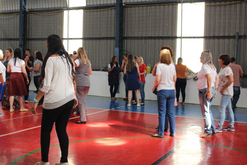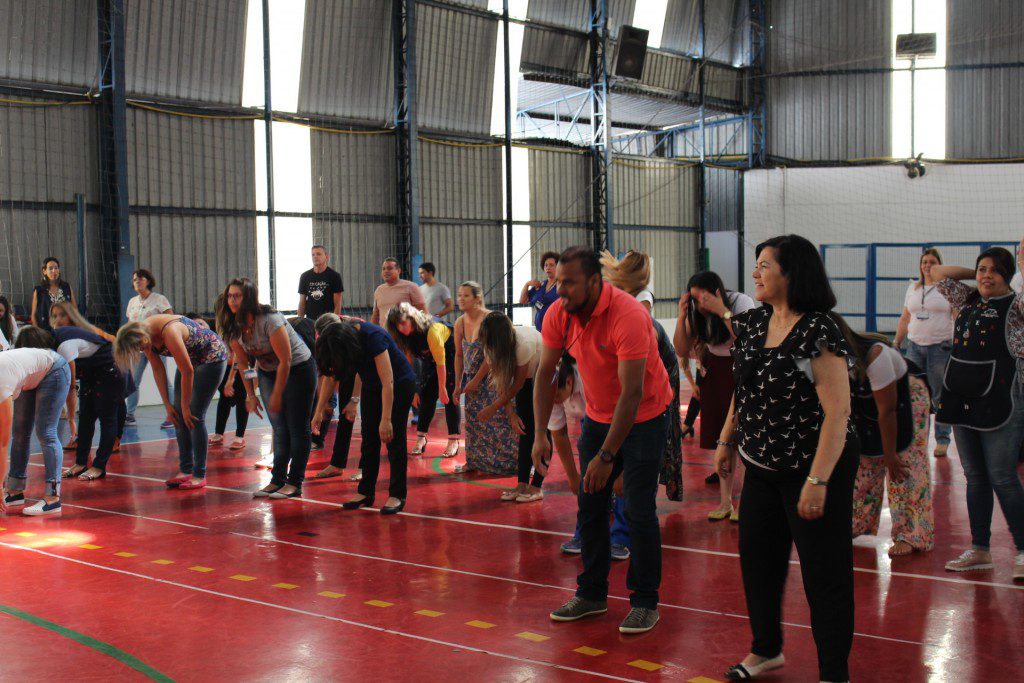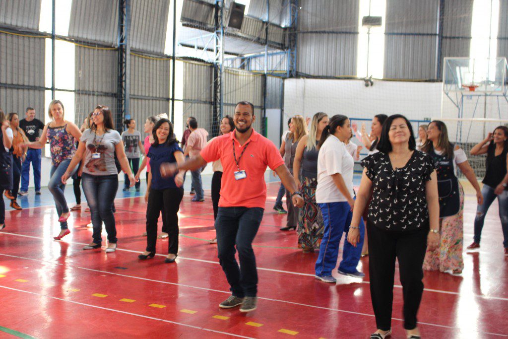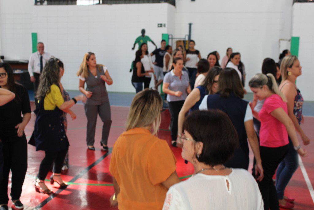 As boas vindas da Direção e uma breve reunião; e, logo em seguida, uma dinâmica na quadra poliesportiva, acompanhada, é claro, pela dupla que pôs os professores para dançar músicas atuais e antigas. Cada um com seu estilo e sem se preocupar com o ritmo dos passos distribuía sorrisos e abraços aos colegas de trabalho.