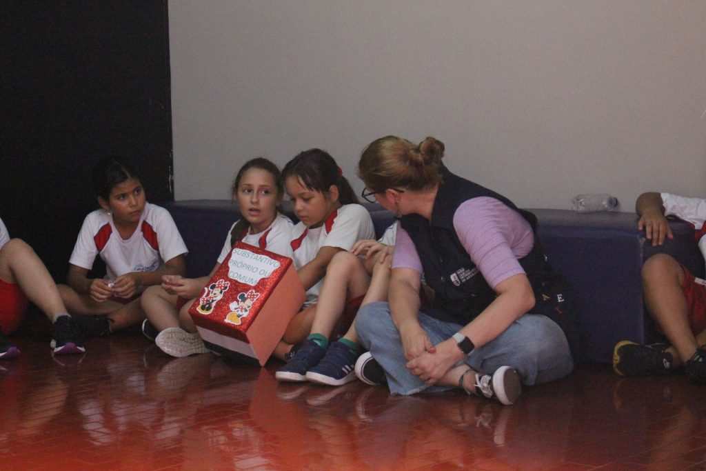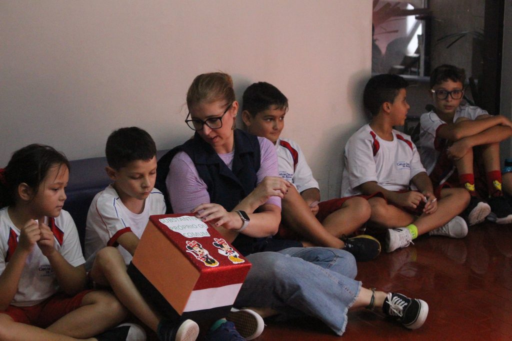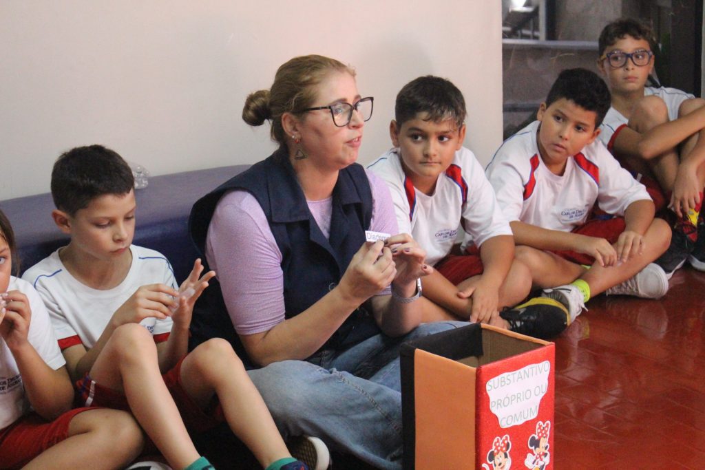 Estudando substantivos próprios e comuns, a turma do 4º ano B realizou uma atividade divertida para desafiar seus conhecimentos. Reunidos em uma roda, cada aluno deveria pegar uma palavra na caixa dos substantivos e classificá-la como substantivo comum ou próprio.