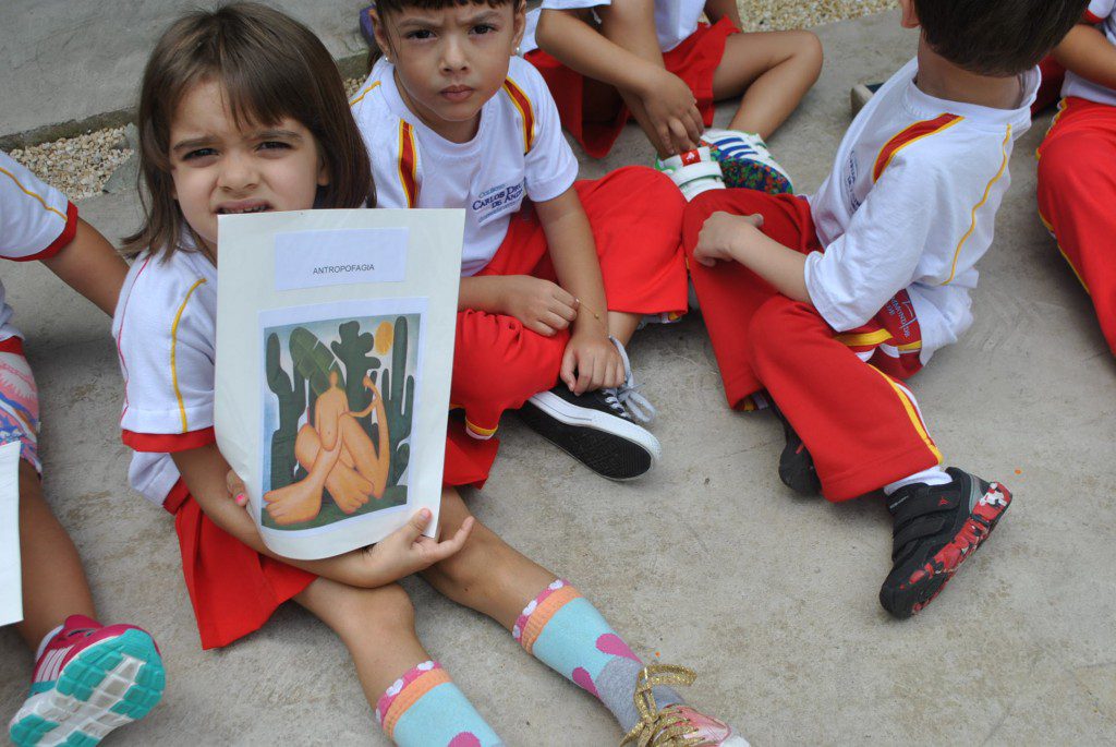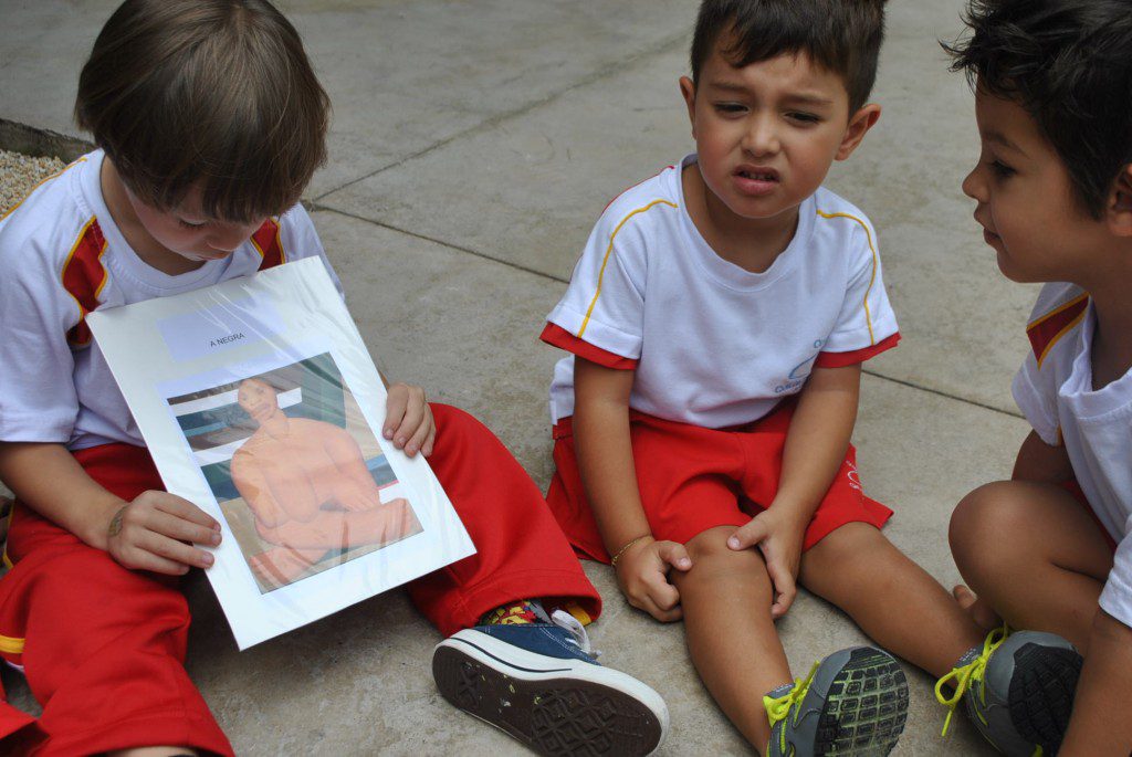 Os alunos do Jardim I conheceram, na aula de hoje, um pouco sobre as obras e a vida da pintora Tarsila do Amaral. Eles puderam ver algumas das mais famosas obras pintadas por essa famosa artista, como: Abaporu, O lago, Os operários, Antropofagia, entre outros.
