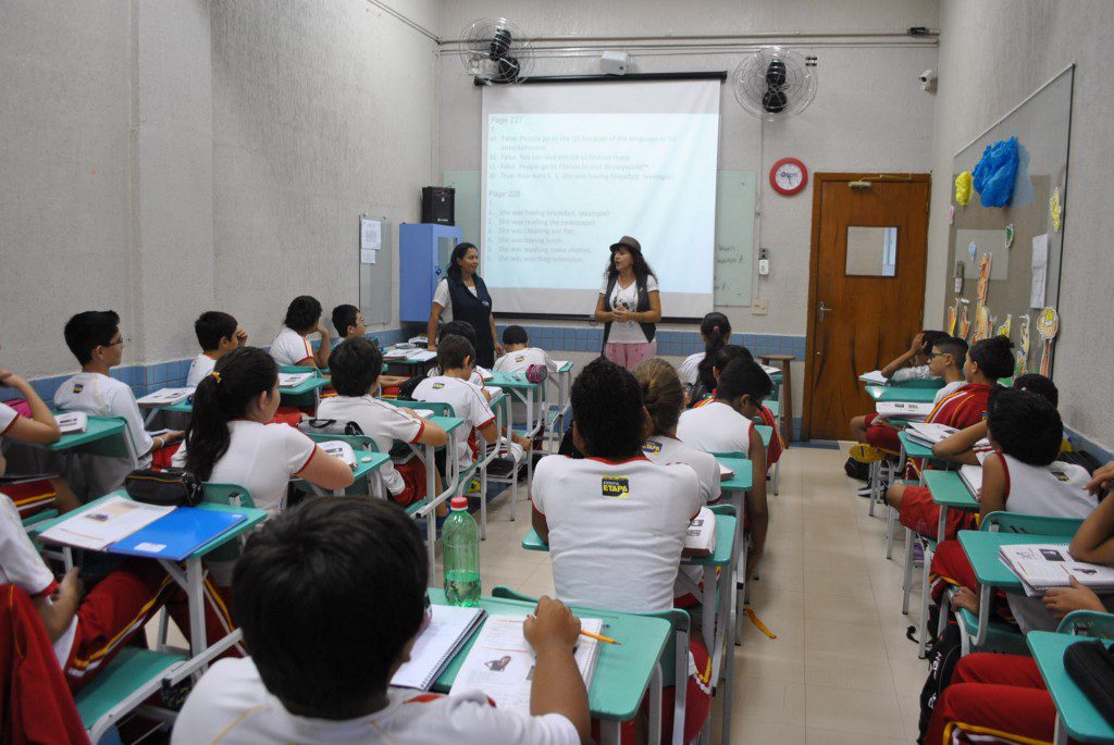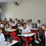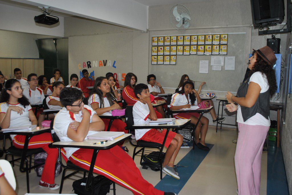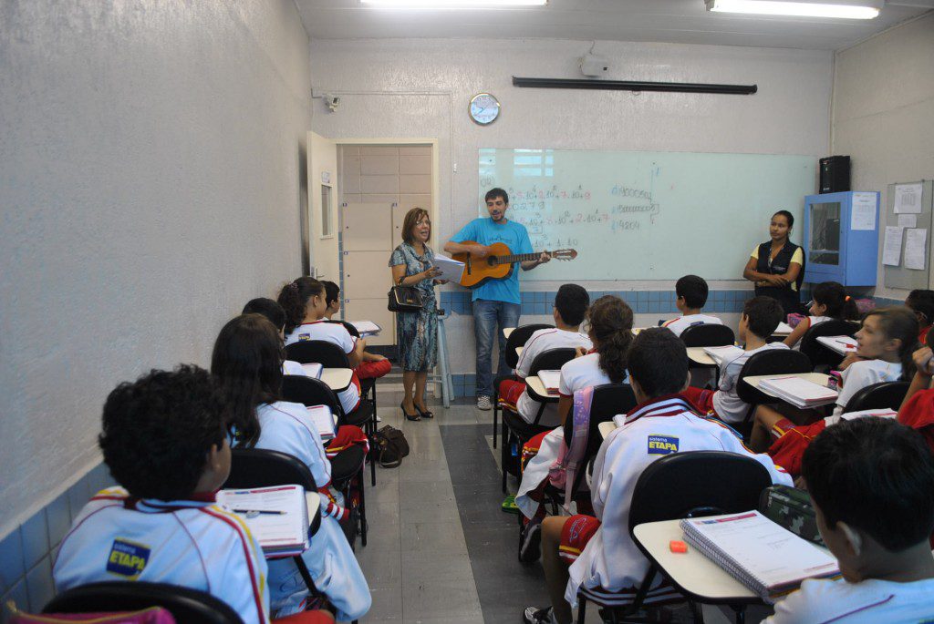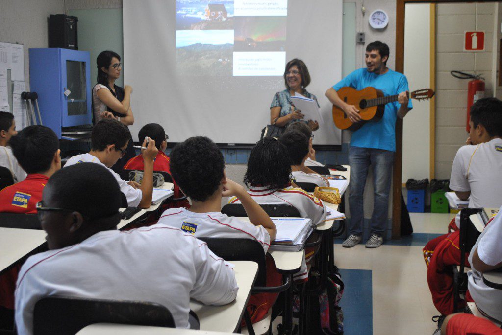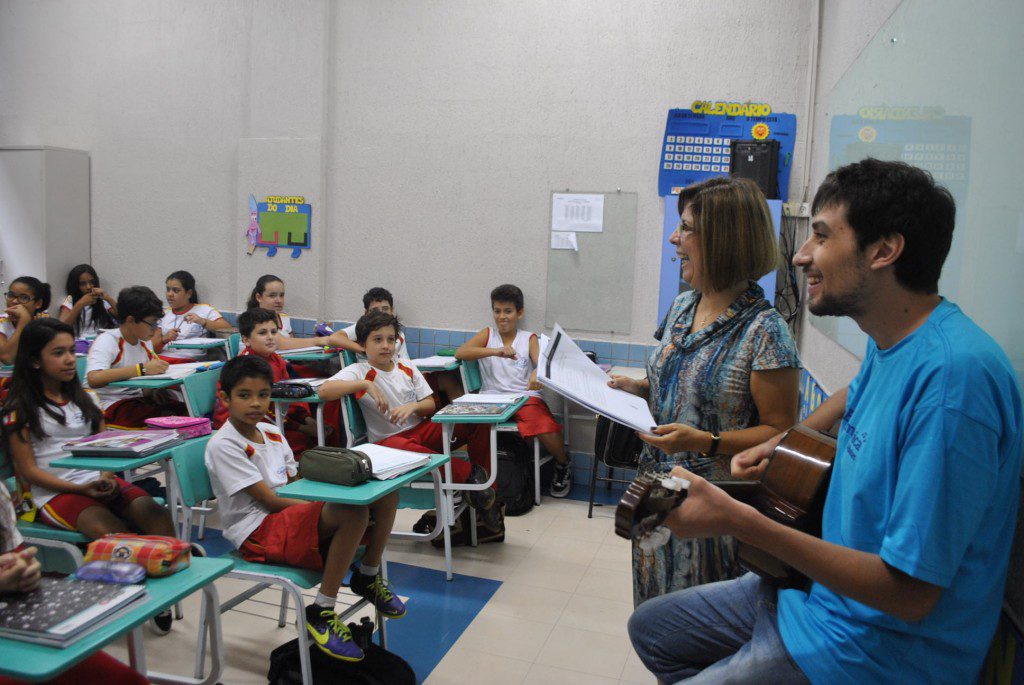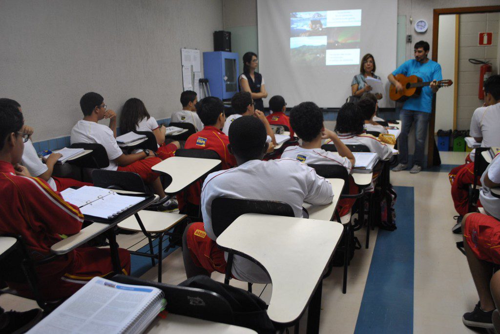 Os professores de violão passaram em todas as salas, conversaram com os alunos sobre as aulas e cantaram um trechinho de uma música, acompanhados pelo coral de alunos: essa interação foi muito legal.